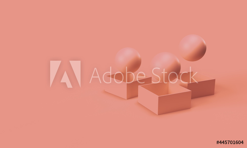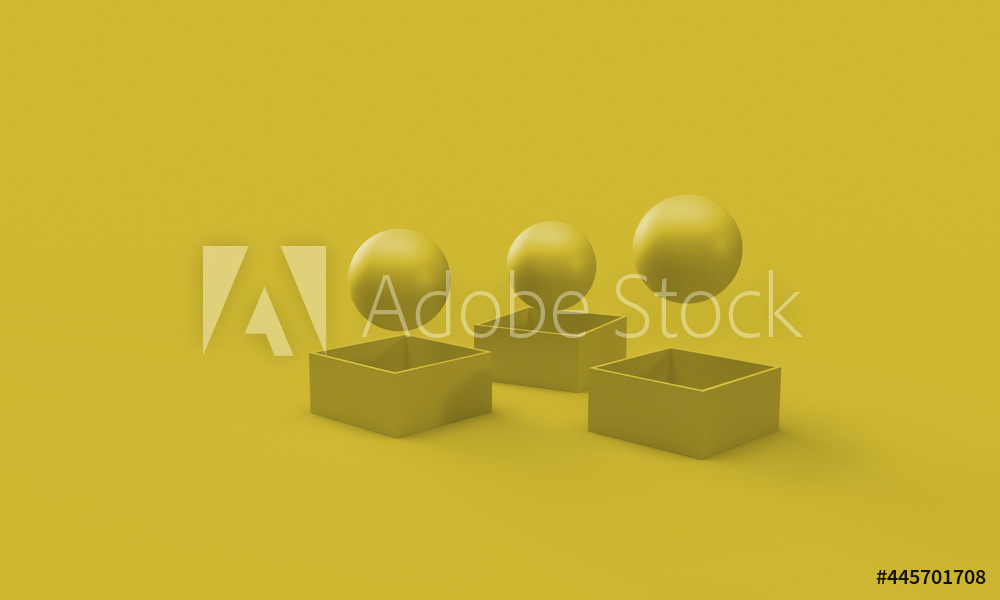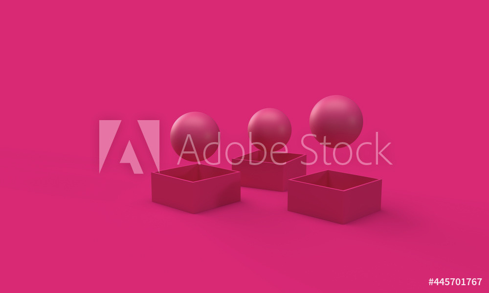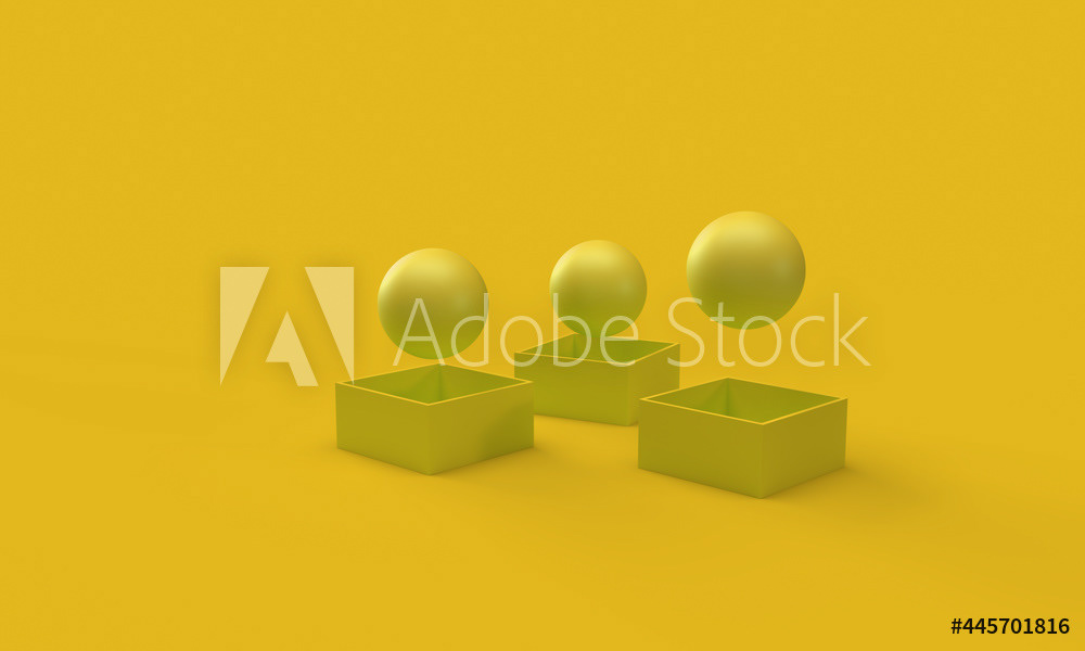 The background is bright colors, matte texture. The balls fly out of the boxes. The pattern of balls and boxes. Abstract, modern, minimal style of illustration. 3d rendering of the composition.