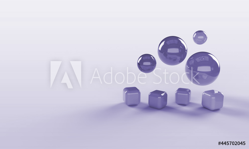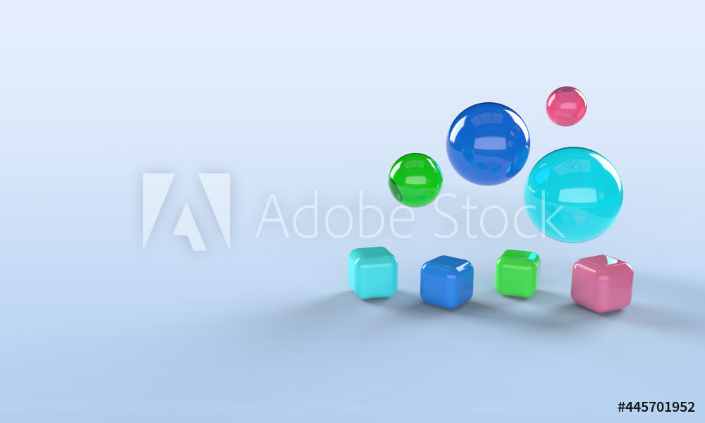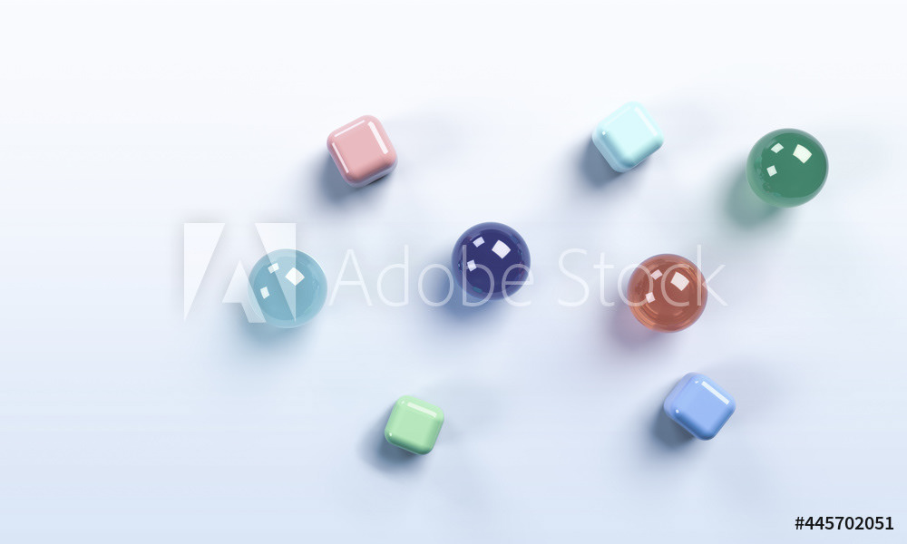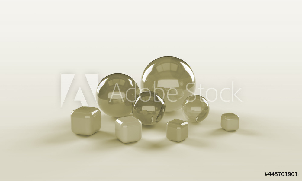 Light background. A pattern of abstract shapes of balls and cubes. Glass glossy texture. Minimal, modern composition.