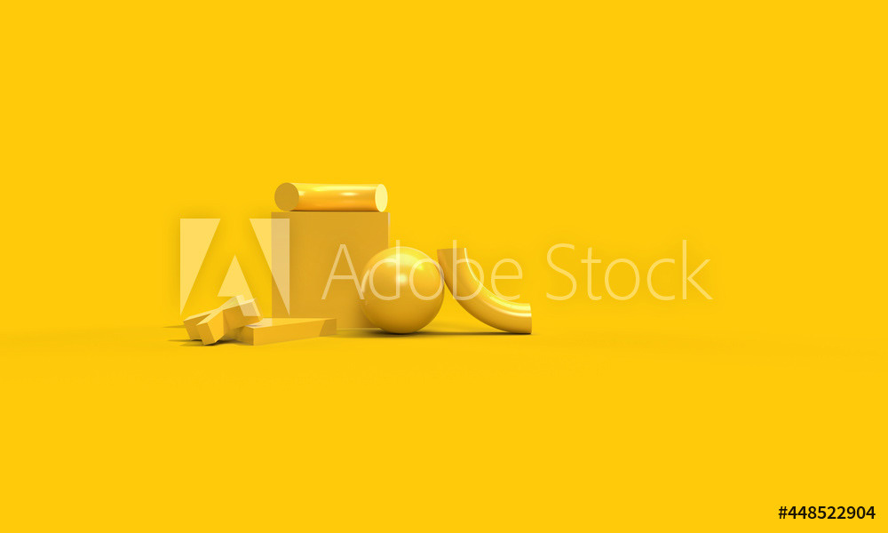 Abstract figures of a cube, a ball, a bagel. The color is yellow, white, blue, soft pink. 3d rendering of the illustration.