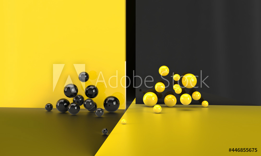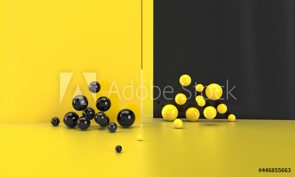 Black and yellow balls in front of a black and yellow wall. Two separated colors. Glossy, shiny shade. Modern style, abstract composition of the background. 3d render of the illustration.