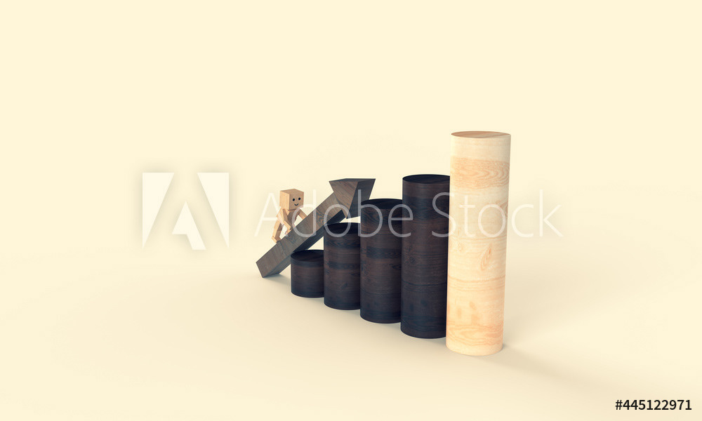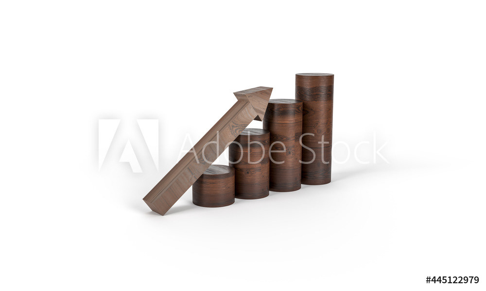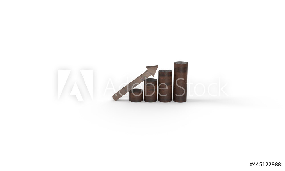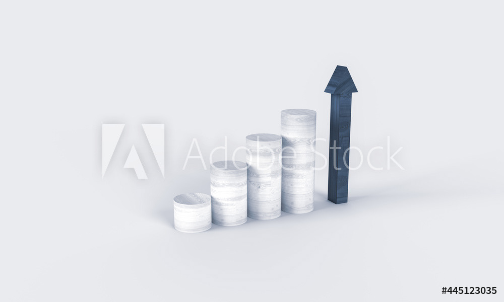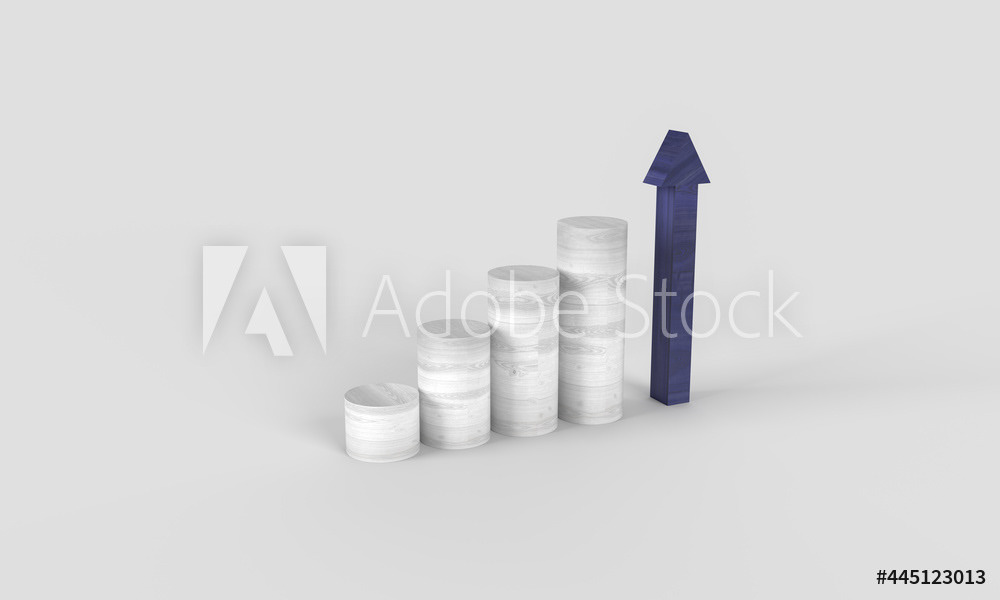 Wooden stairs made of barrels, steps. Up arrow. Composition on the topic of economics, business, work, success, investment. Wooden texture of a ladder made of barrels. 3d render of the illustration. Minimal background style.