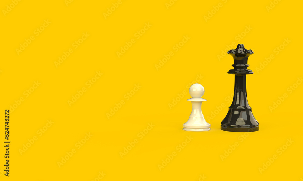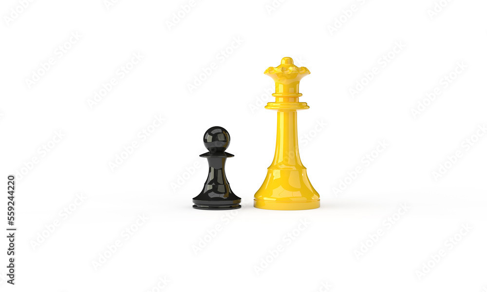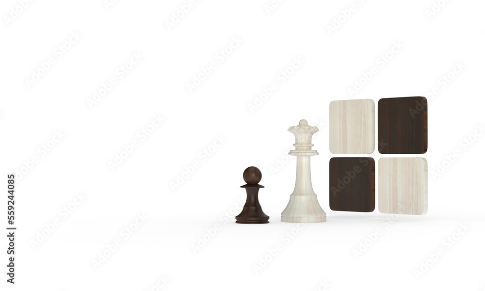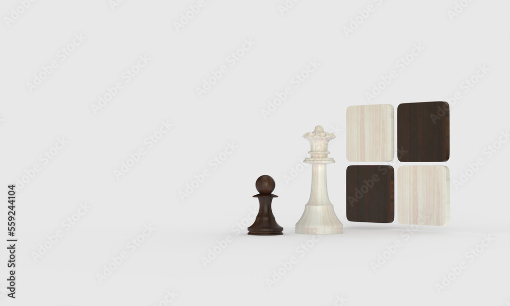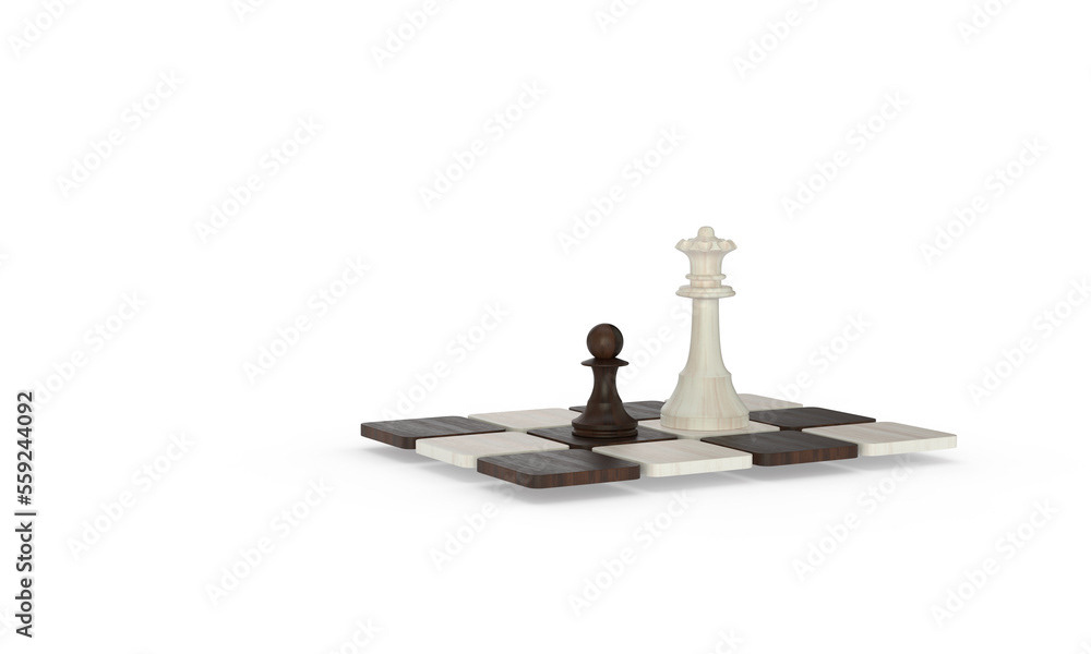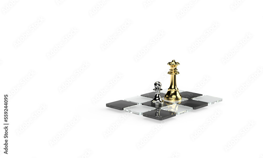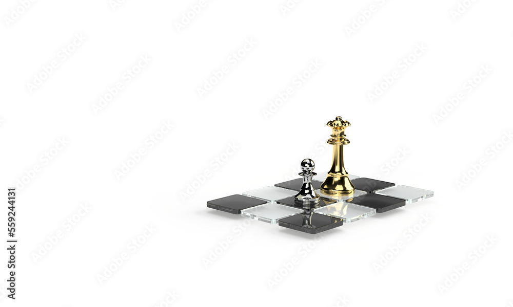 3d rendering of illustrations of chess pieces of the king and pawn, as well as the chessboard. Illustration on the topic of business, work, strategy, technology, thinking. Modern style.
