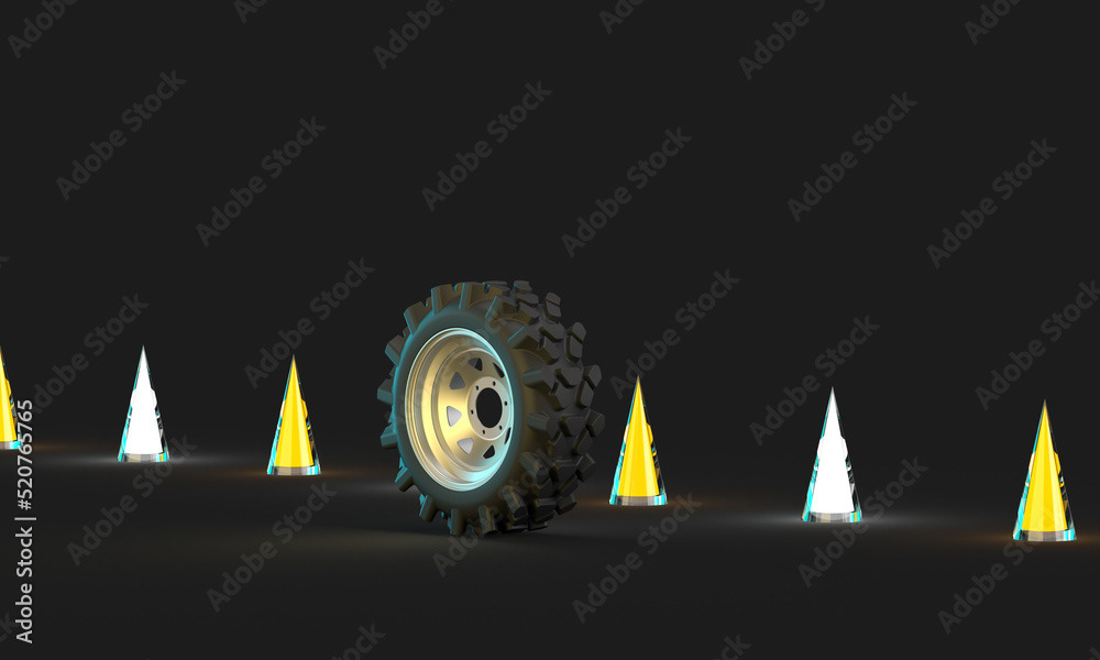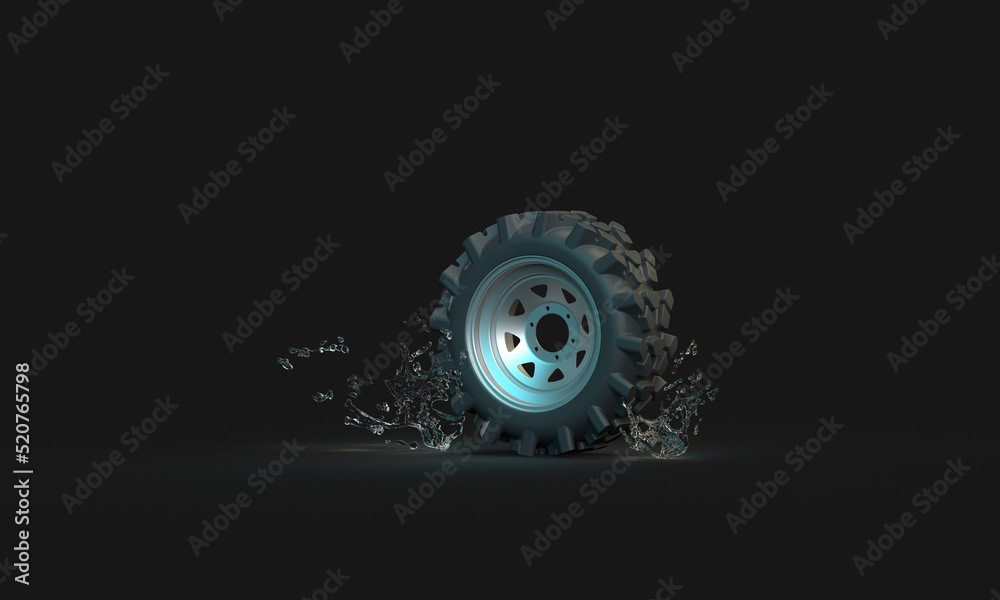 3d rendering of an illustration of a car off-road wheel. Illustration on the theme of an SUV, cars, tires, wheels, car service and repair.