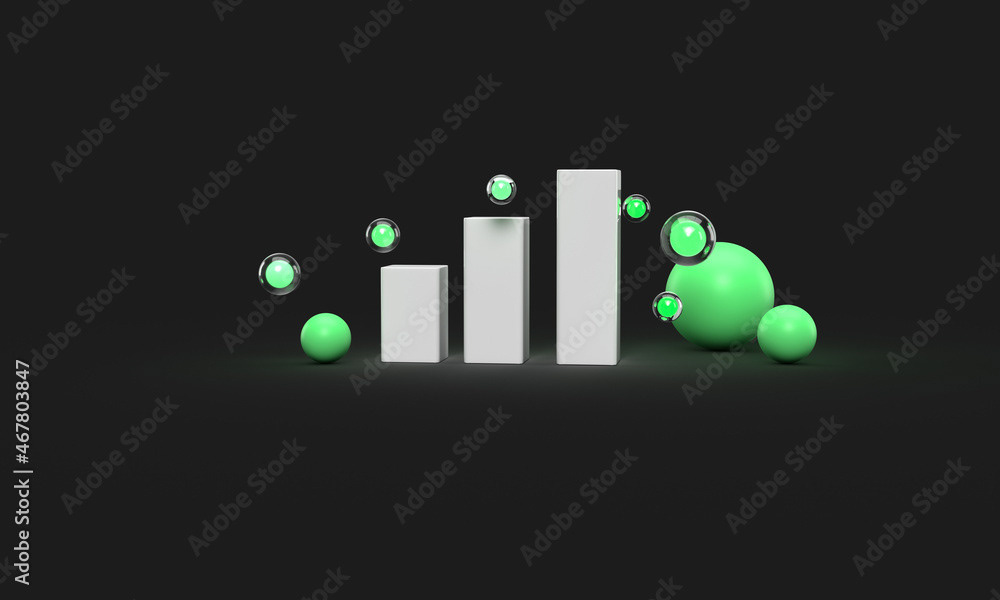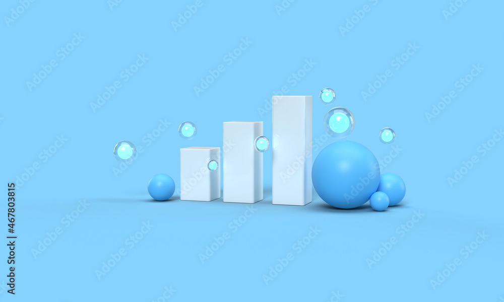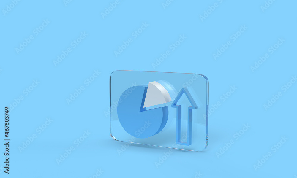 3d render illustrations on analytics, statistics, dashboard, data analysis. Minimal style. Glass dashboards, cubes with graphs, up arrows.