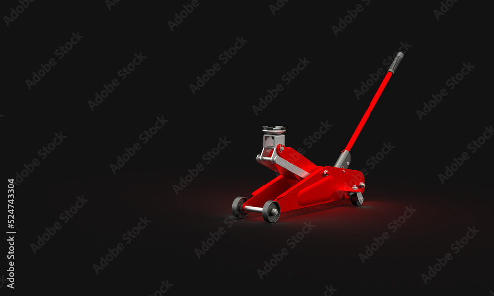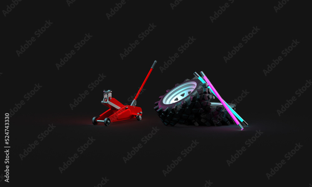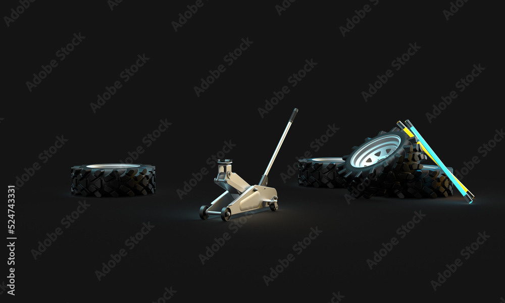 3d render of an illustration of a car jack and wheels. Pattern of wheels, jacks. Illustration on the topic of car service, tire repair, repair, tires, wheels, cars, machinery.