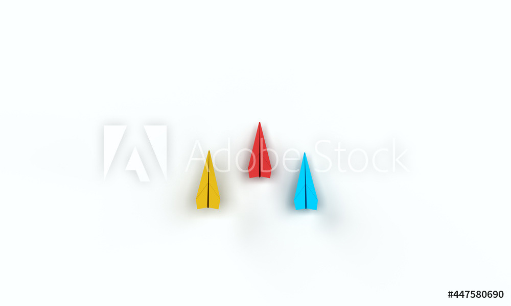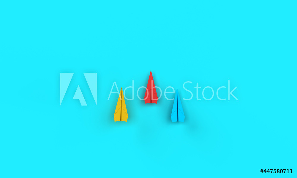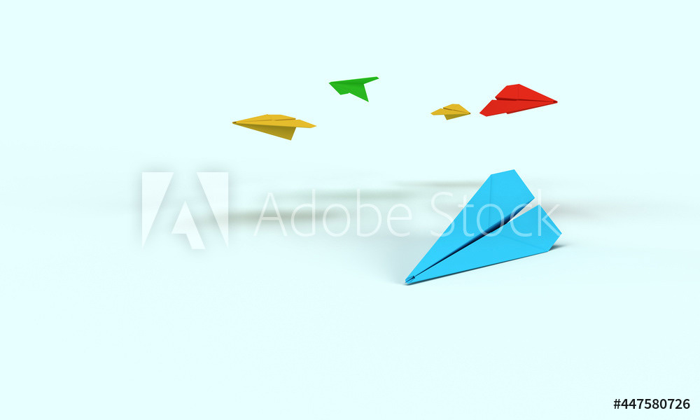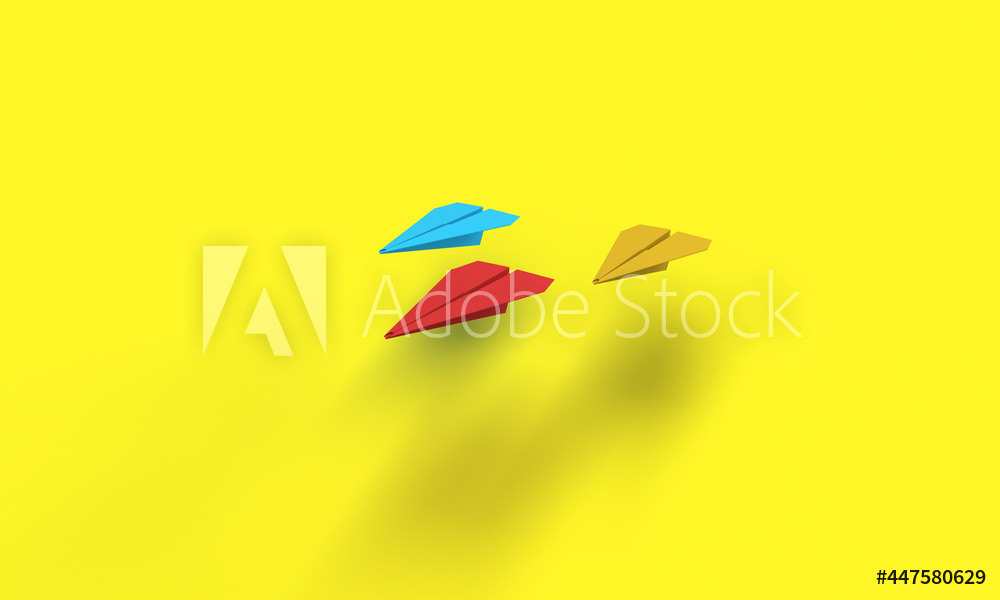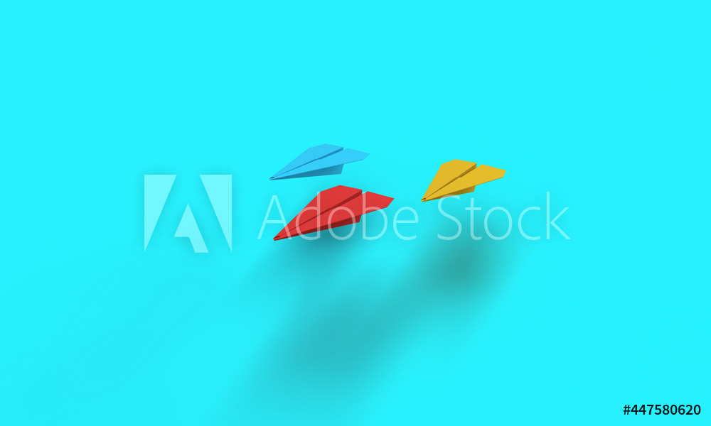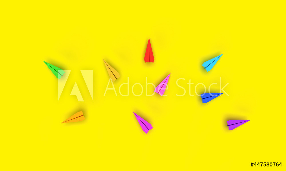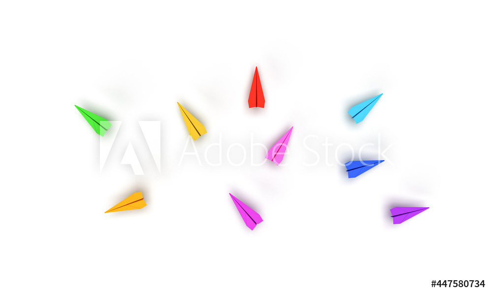 Colorful paper airplanes on a bright, bright background. 3d rendering of the illustration.
