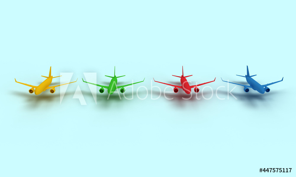 Four multi-colored planes on a light background. The plane is red, yellow, green, blue matte color. Abstract compositions on the topic of travel, flights, planes, trips, airports, recreation, tickets. Modern, minimal style. 3d rendering of the illustration.