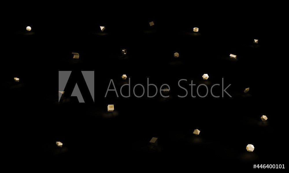 A pattern of abstract geometric shapes on a dark background. 3d render of the illustration. Shapes of spheres, polygons, balls, squares, crystals. Minimal, modern style. Dark background.