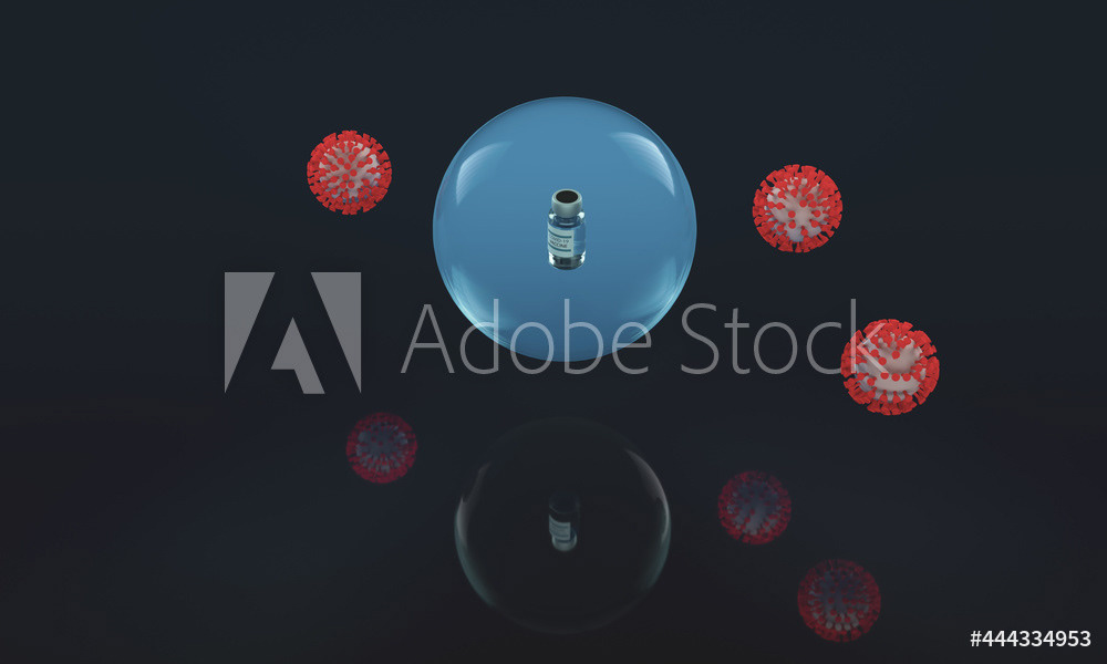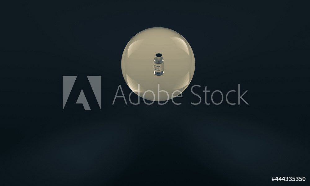 An ampoule with a transparent glass texture inside a transparent ball with protection from bacteria, virus. Outside there is a transparent glass ball, as a protection against the coronavirus, covid-19. Composition on the topic of vaccination, syringe, hospital, vaccination. 3d render of the illustration.