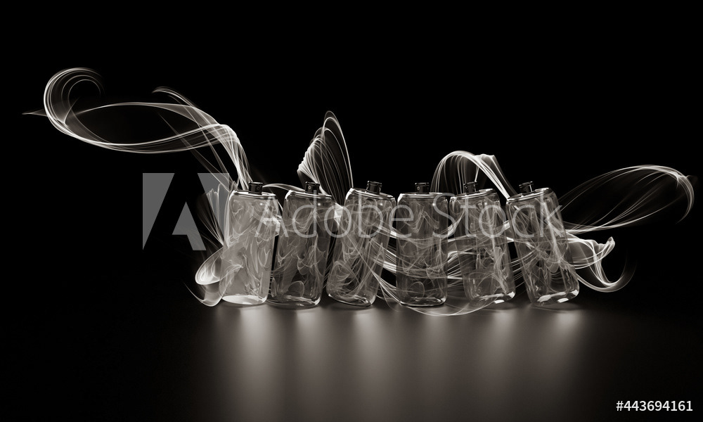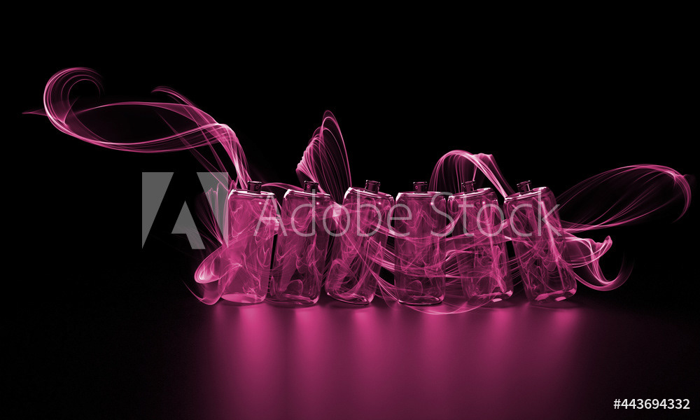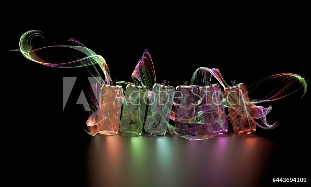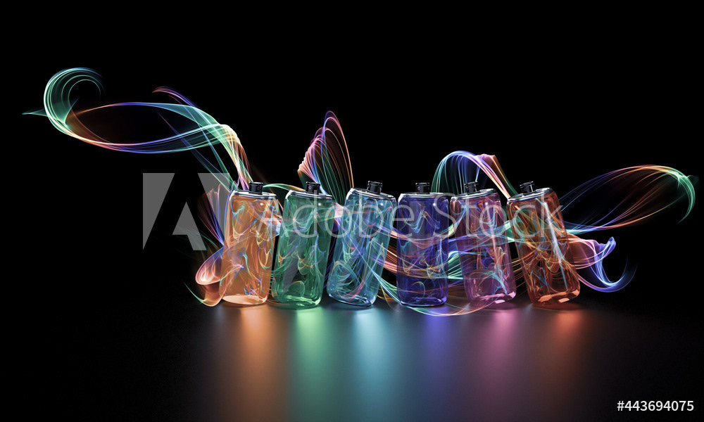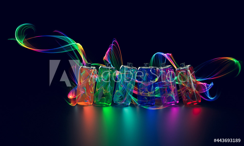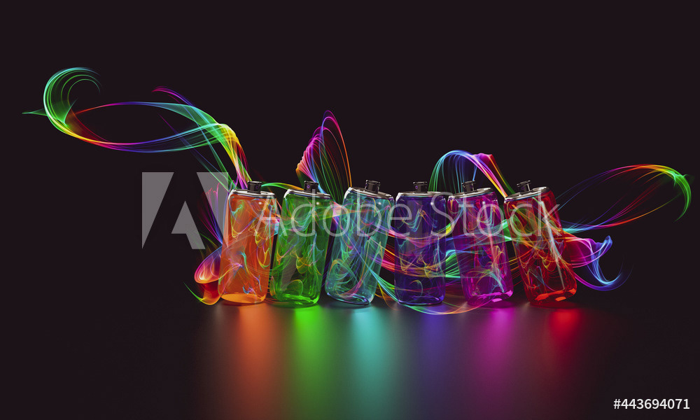 Bright multicolored spray paint. Transparent glass jars with paint. Multi-colored water paint. Magic style. Multicolored lines, water inside the cans. 3d render of an illustration on a dark background.