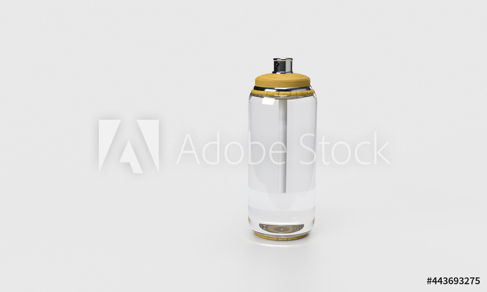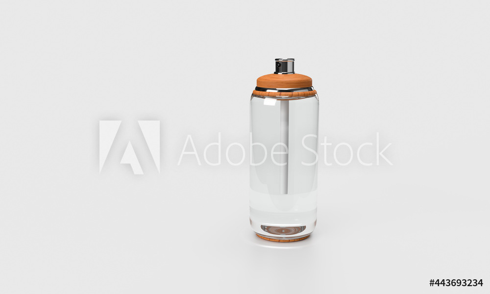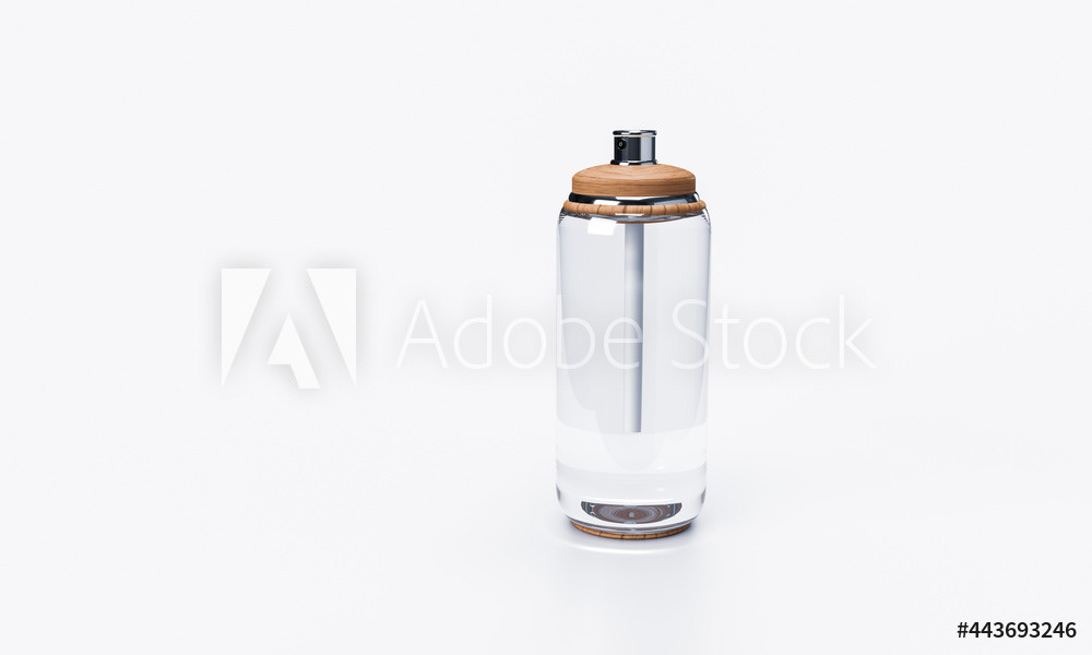 A transparent can of spray for the bathroom. Spray water, moisturizing liquid. 3d render of the illustration. Light background, a glass jar with a wooden lid.