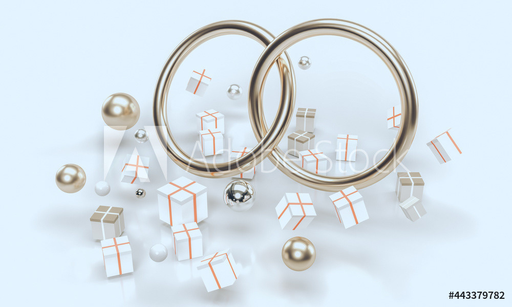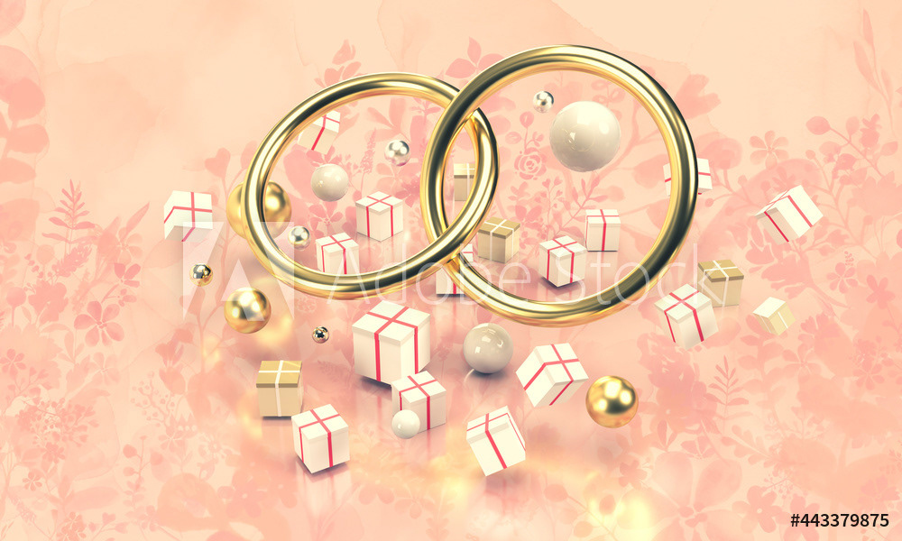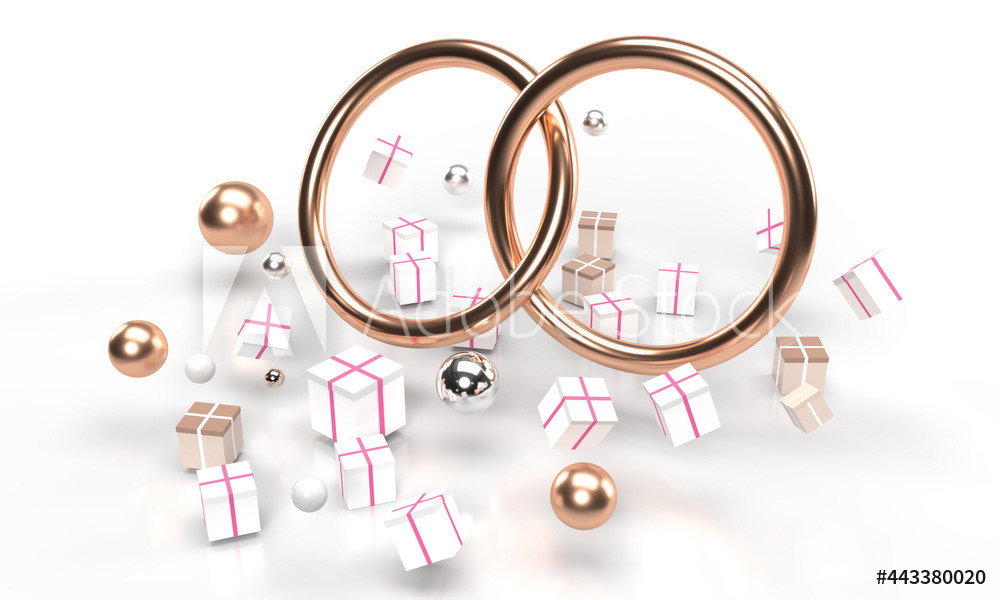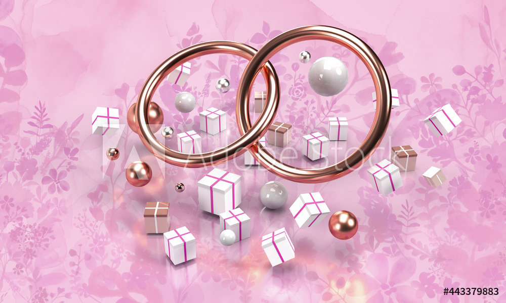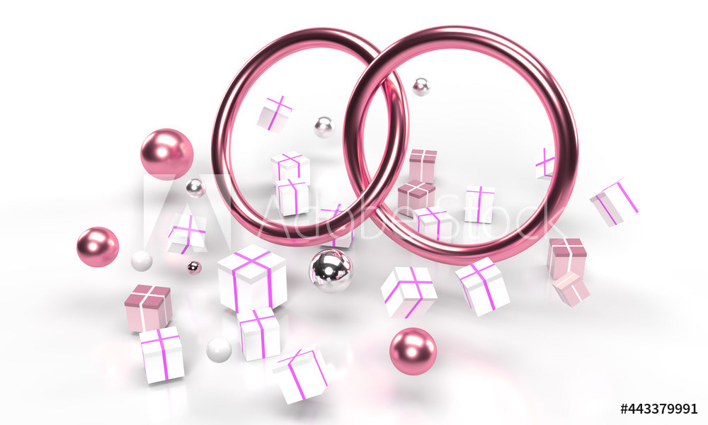 Gold wedding rings with gifts and balloons. Light white, pink background. 3d render of the illustration.