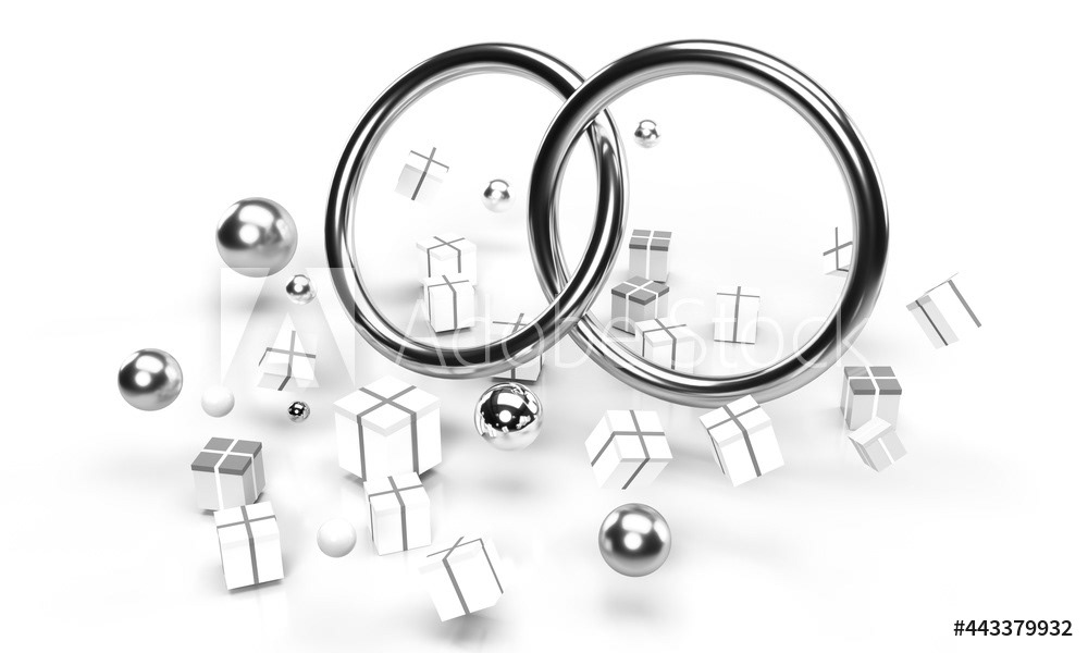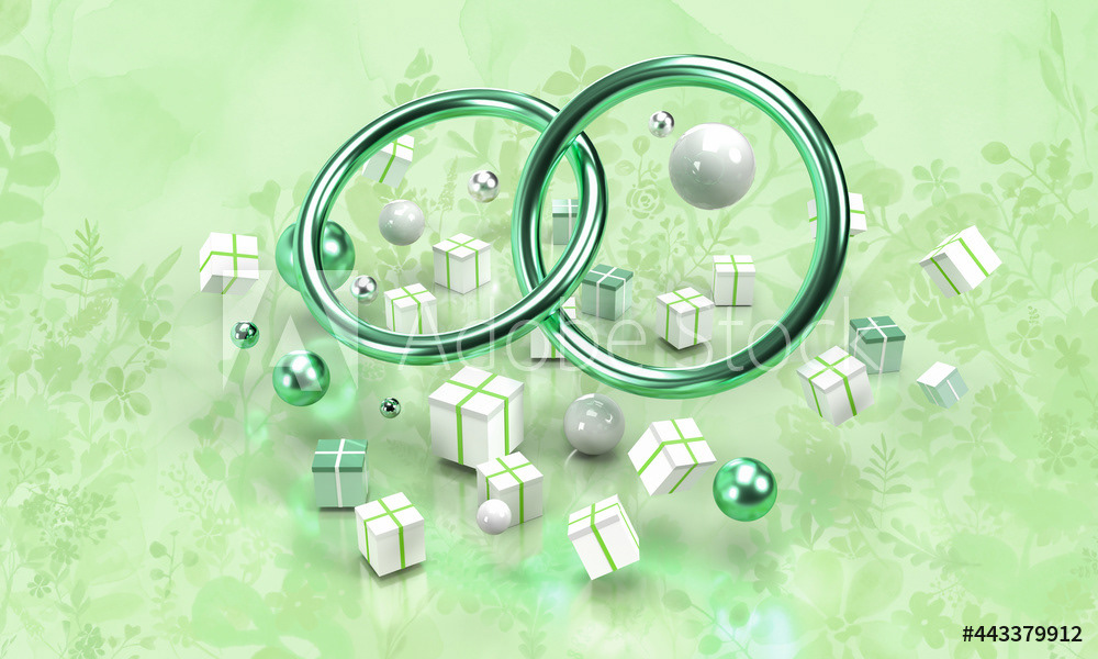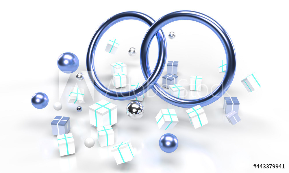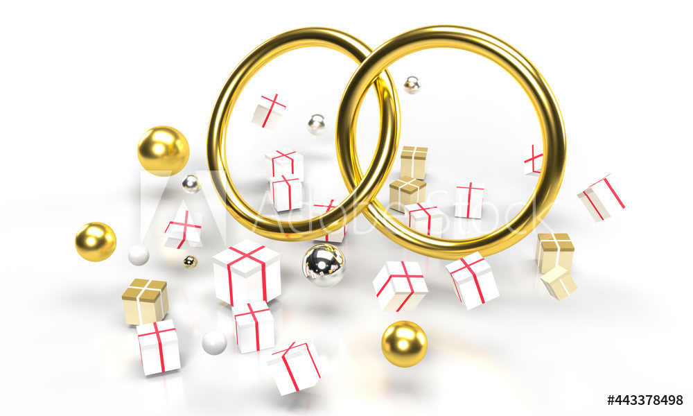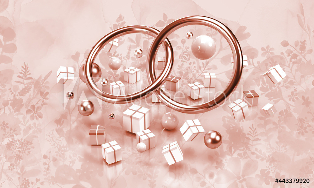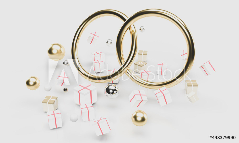 Gold wedding rings with gifts and balloons. Light white, pink background. 3d render of the illustration.
