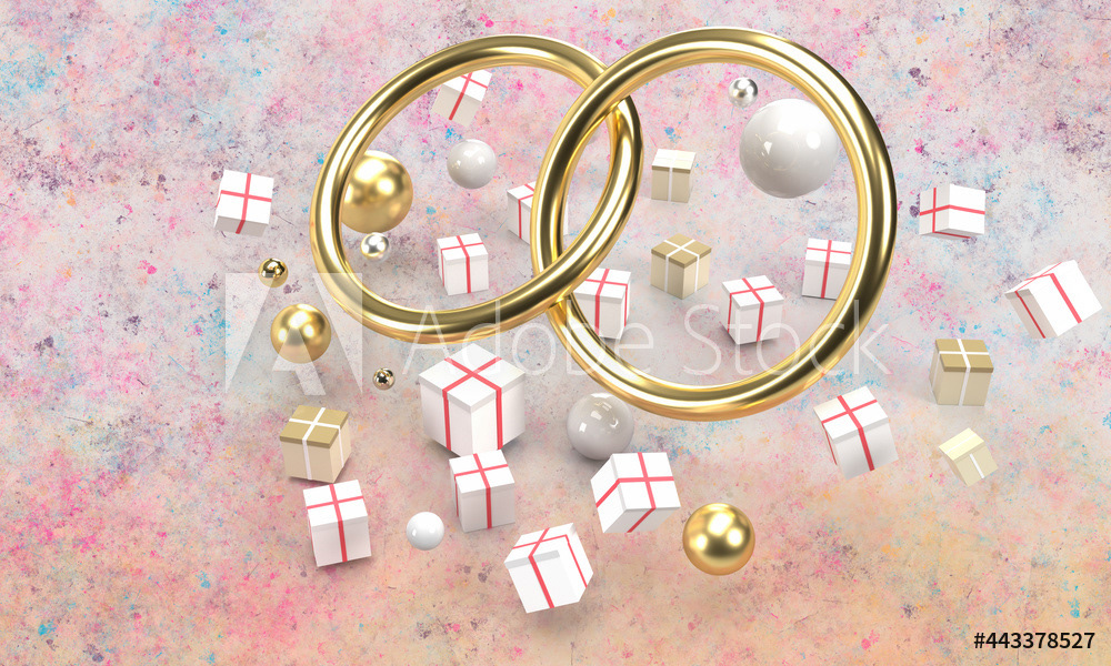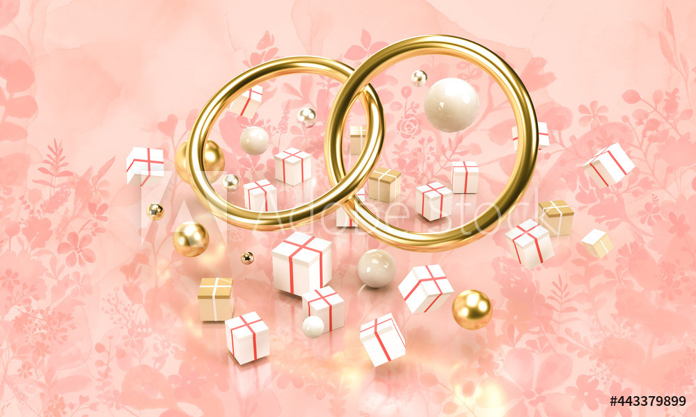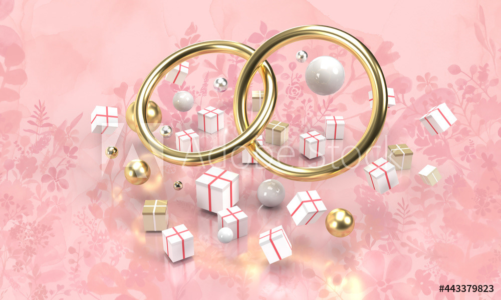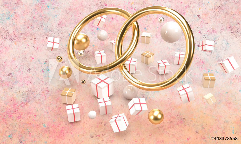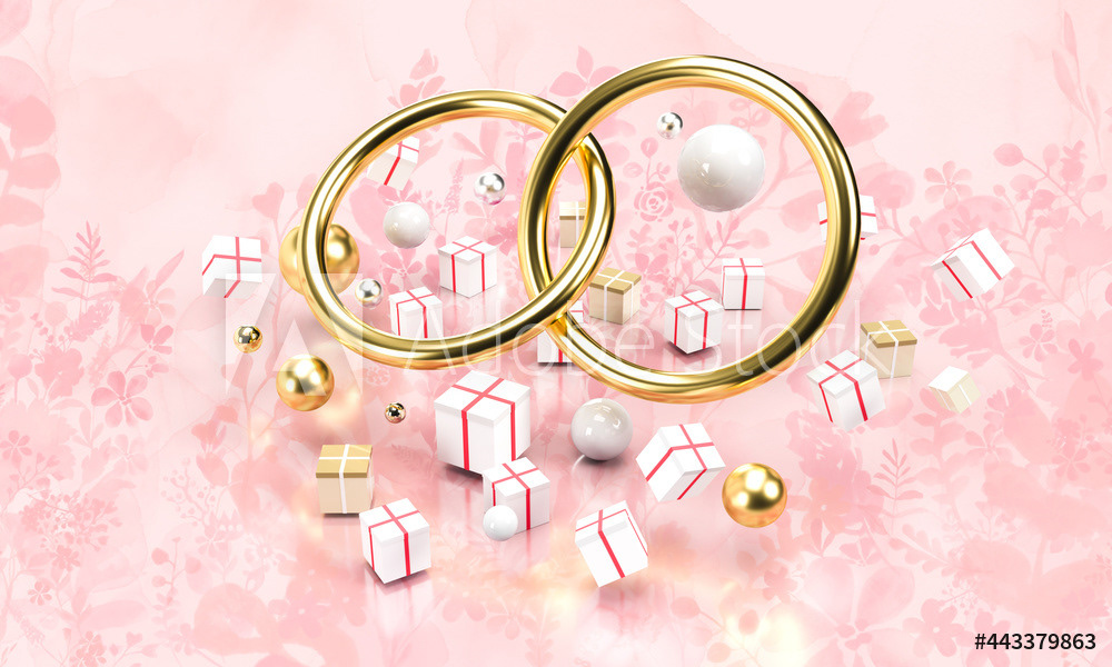 Gold rings on a pink, white background. Abstract composition on the theme of a holiday, a wedding. Boxes with gifts, balloons. 3d render illustration.