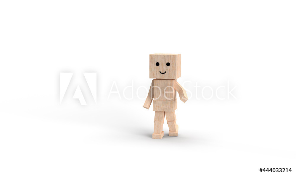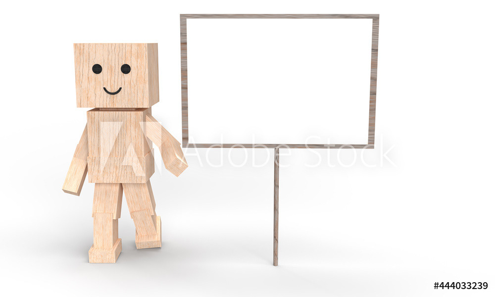 The composition of wooden men. Illustrations little men wave their hand, indicate the direction. Illustration little men close their mouths, eyes and ears. Illustration of a man holding a poster. The texture of light wood. White background, isolated view. 3d render of the illustration. Minimal style.