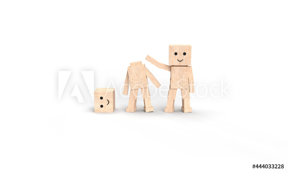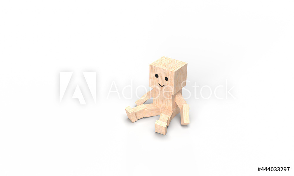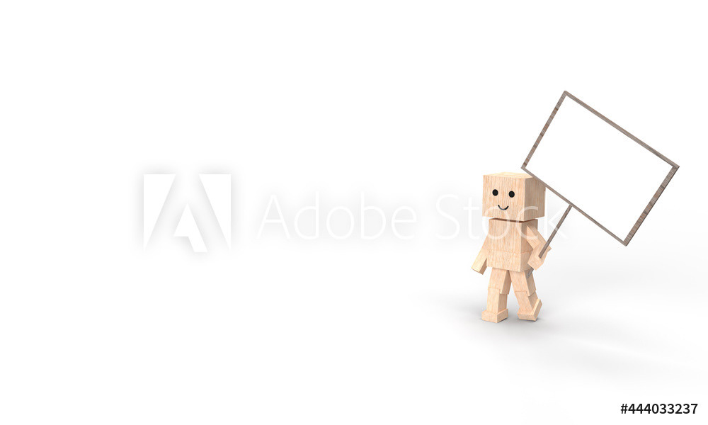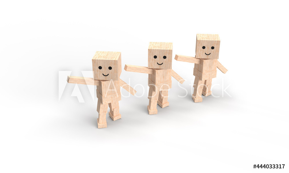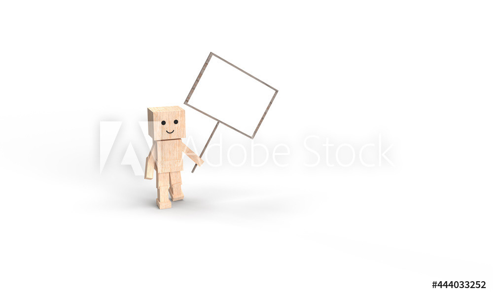 3d render of the illustration. Wooden men wave their hands. They close their mouth, eyes, and ears. A wooden man holds a poster.