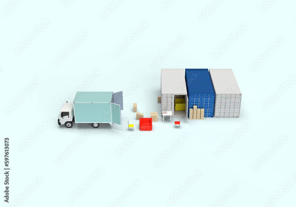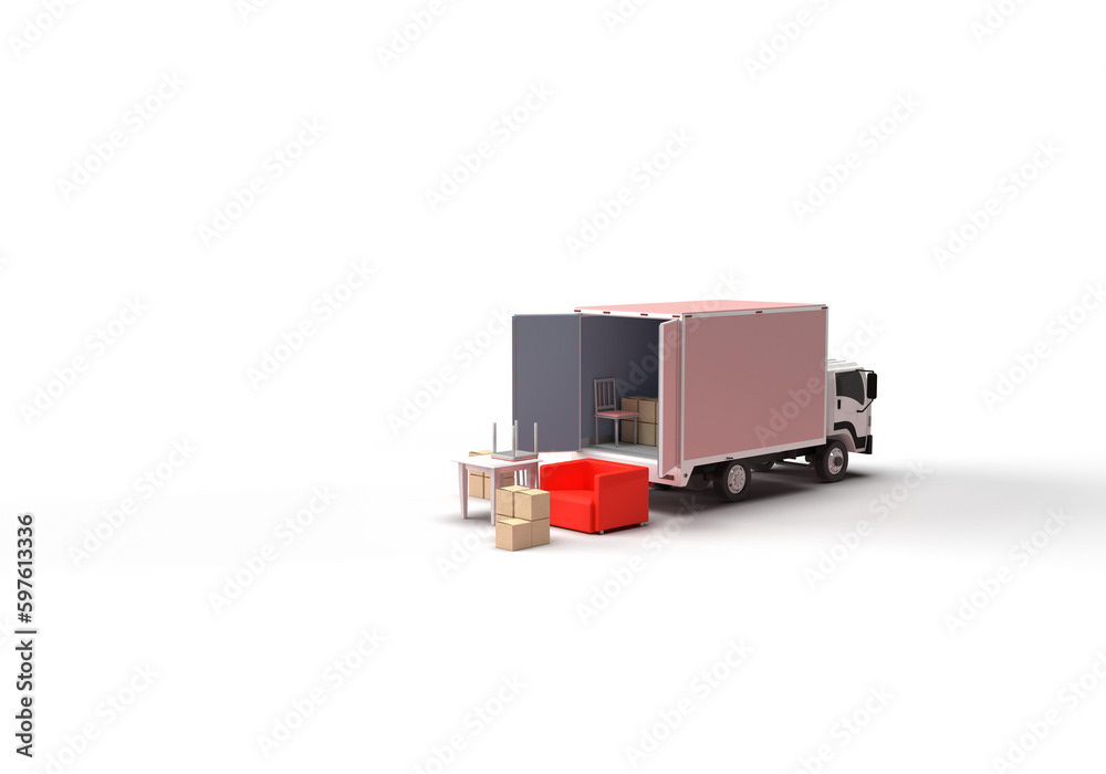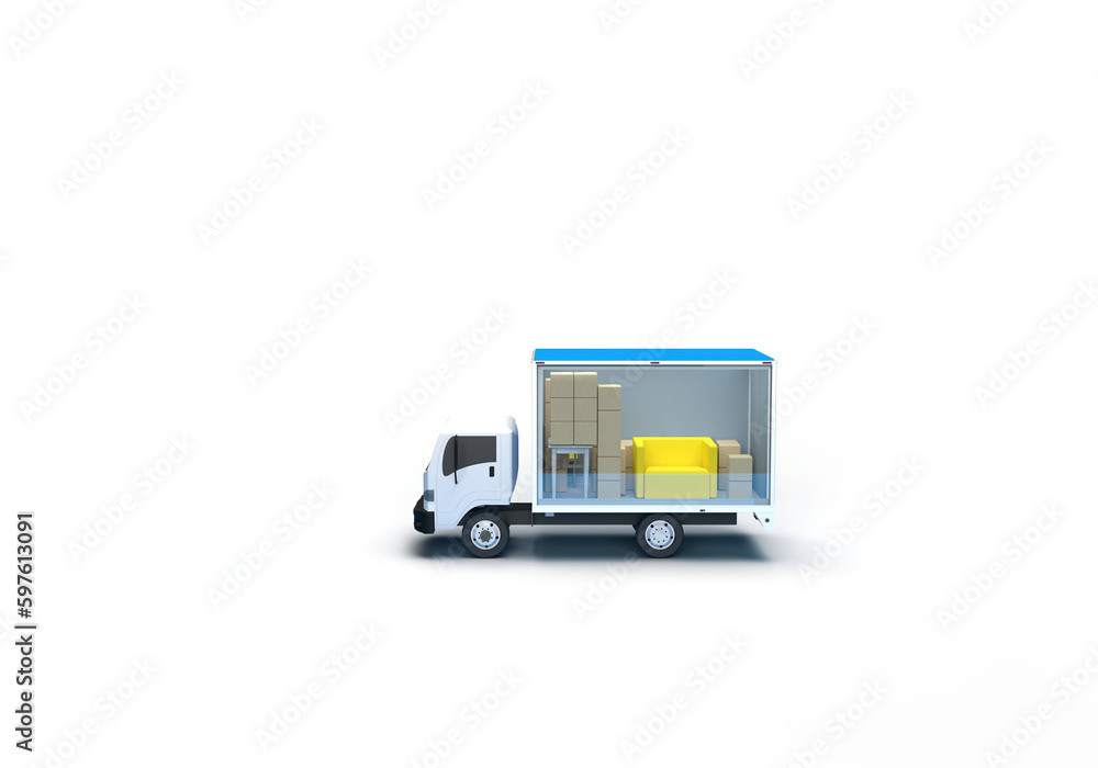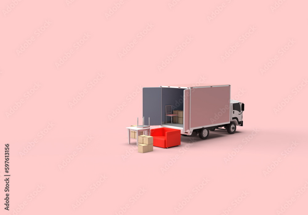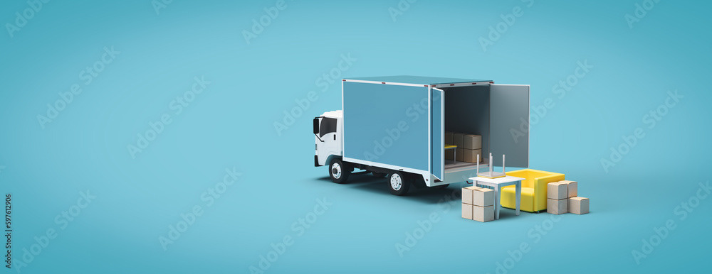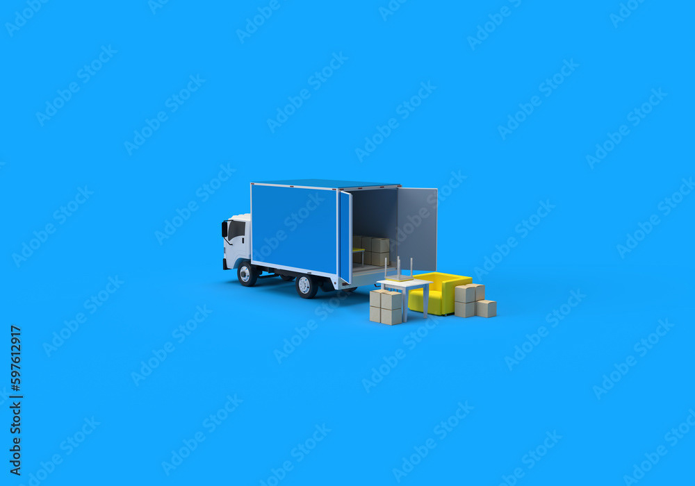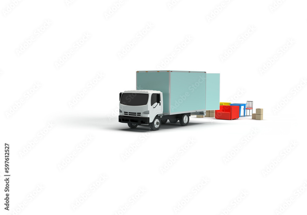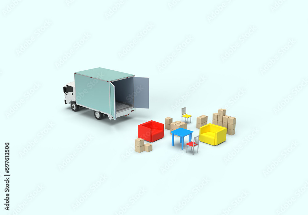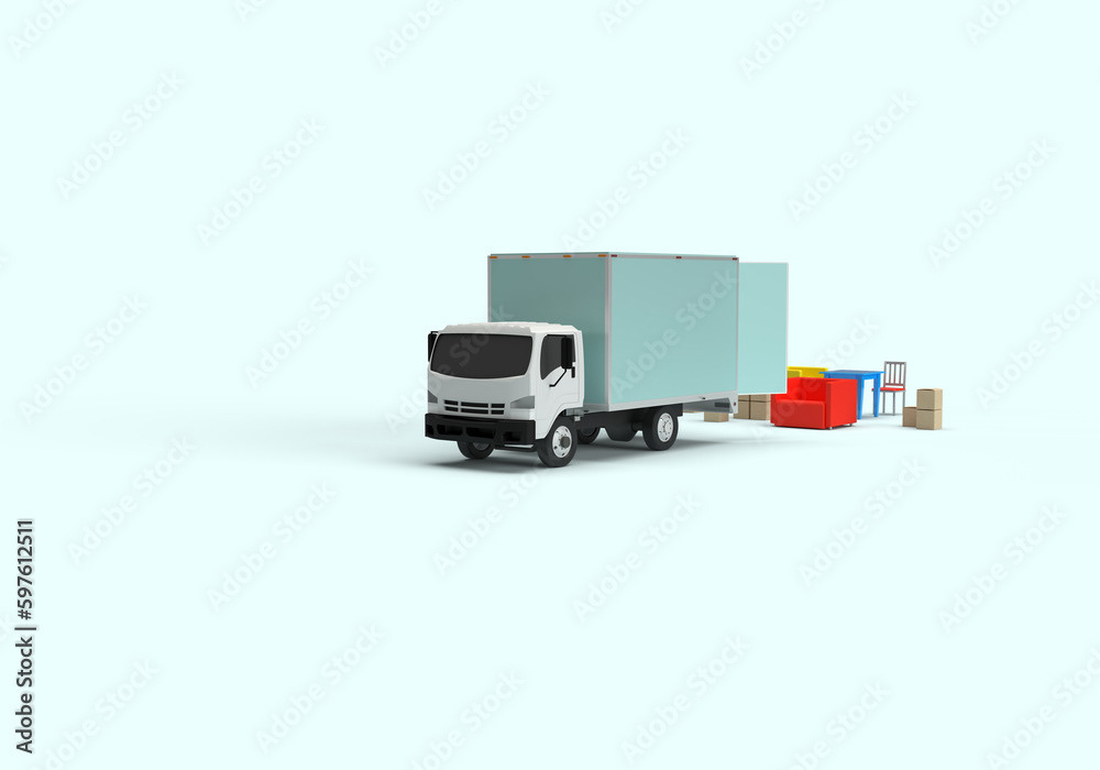 3d render illustrations of a truck, furniture, boxes. Illustration on the topic of cargo transportation, relocation, change of residence, commercial transport, delivery of sea cargo, transport and things. Modern style.