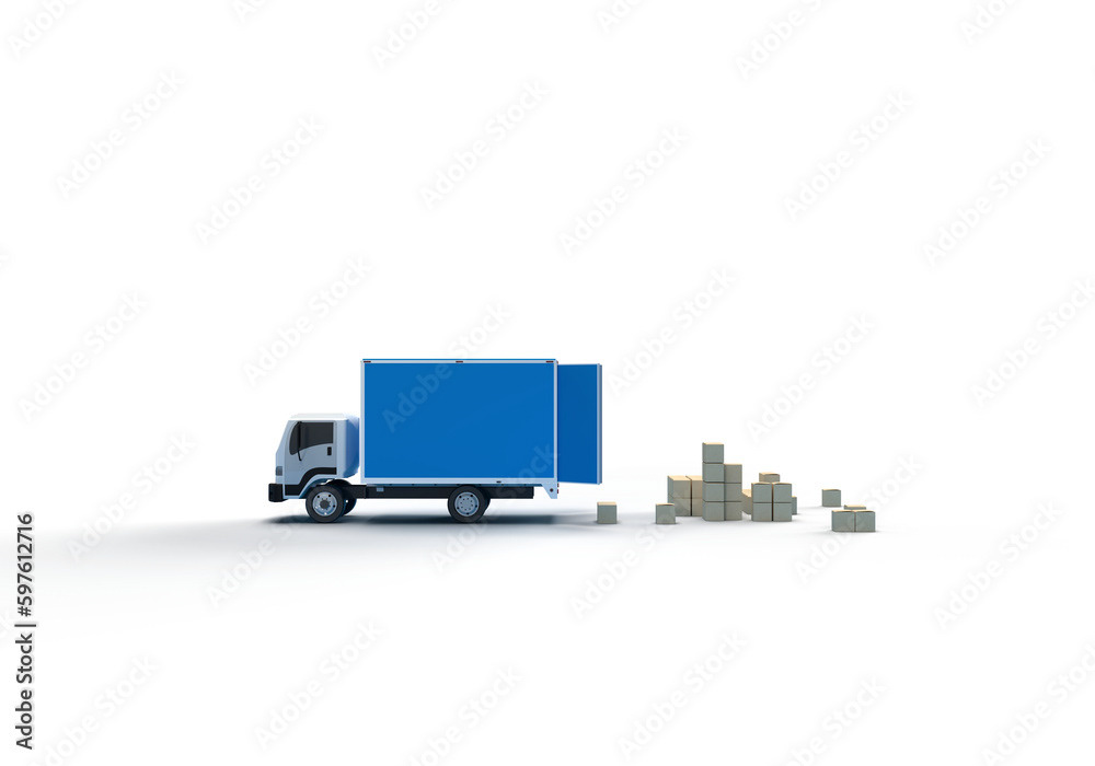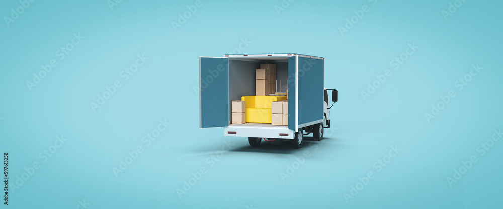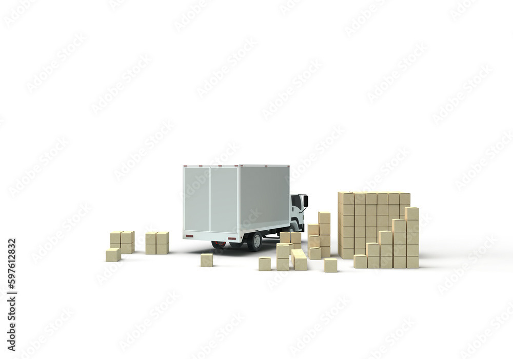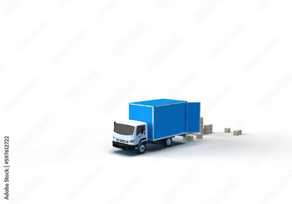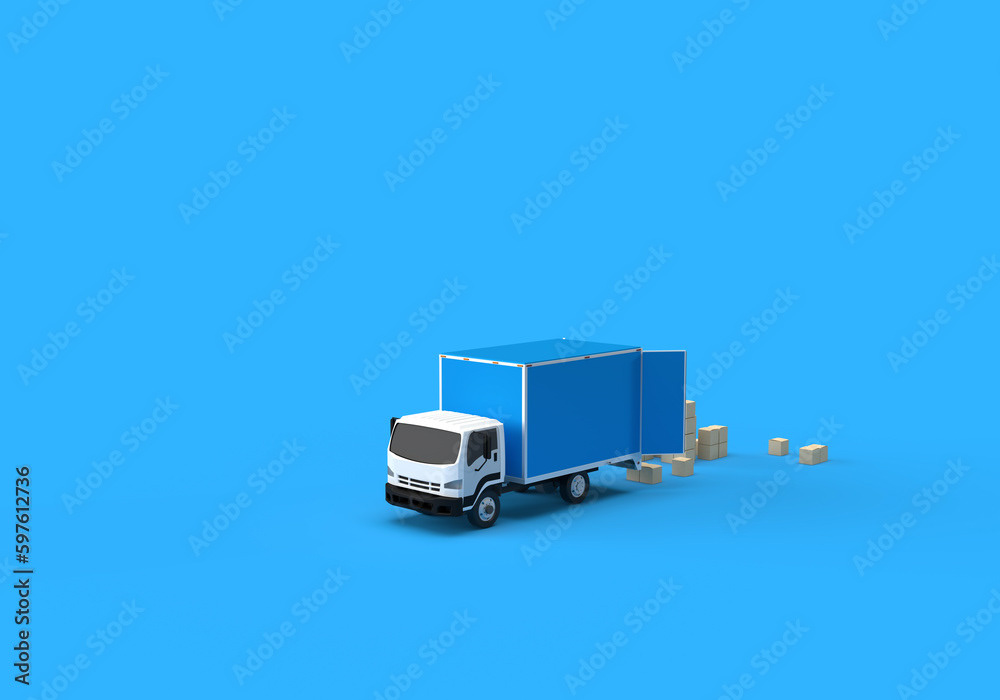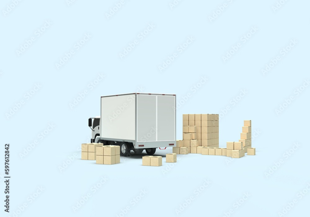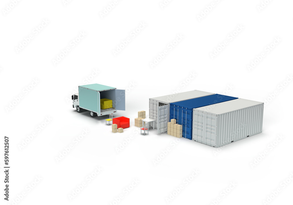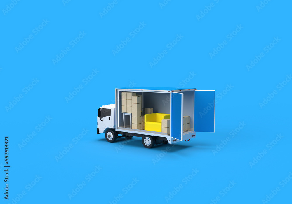 3d render illustrations of a truck, furniture, boxes. Illustration on the topic of cargo transportation, relocation, change of residence, commercial transport, delivery of sea cargo, transport and things. Modern style.