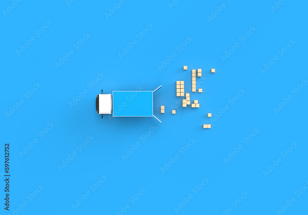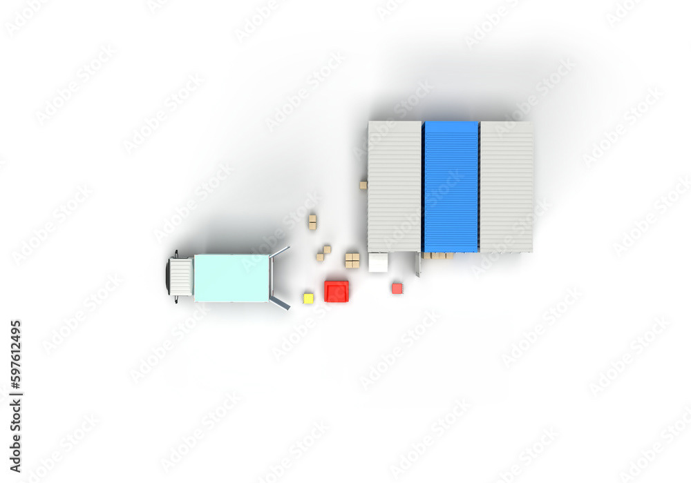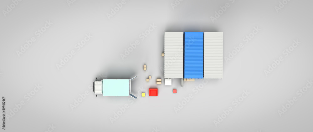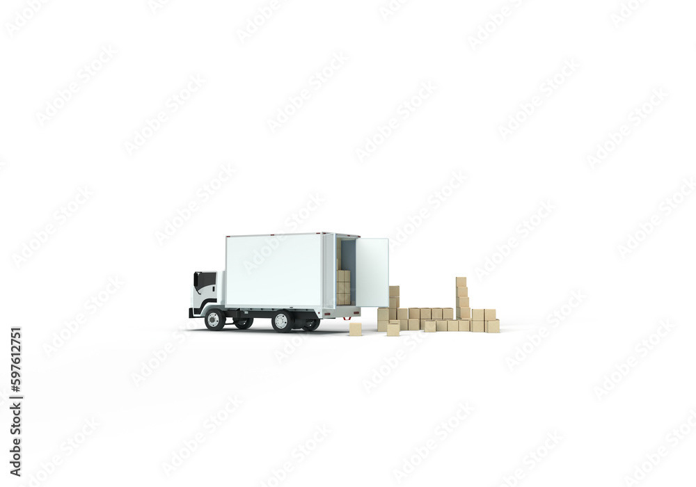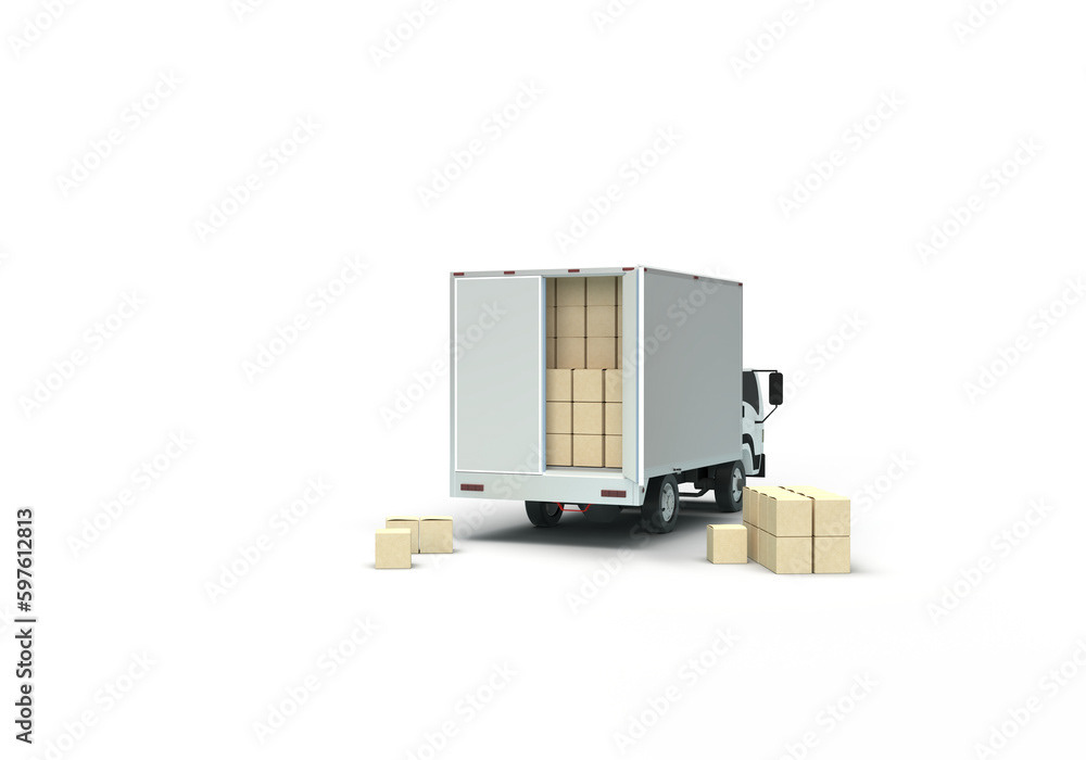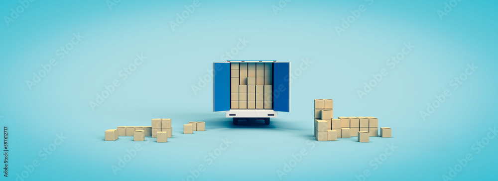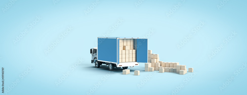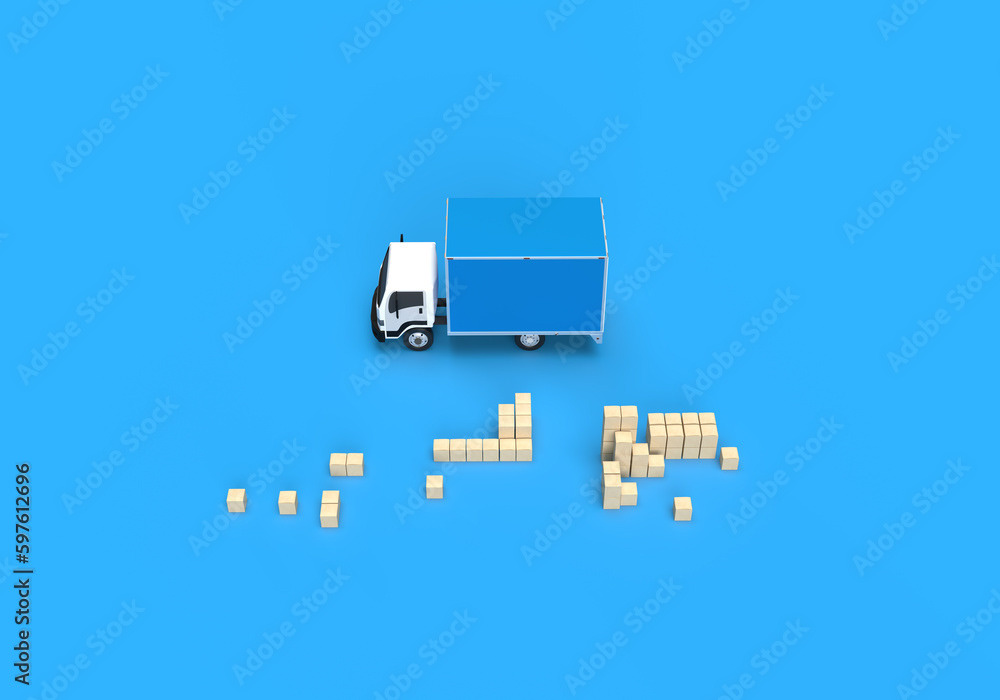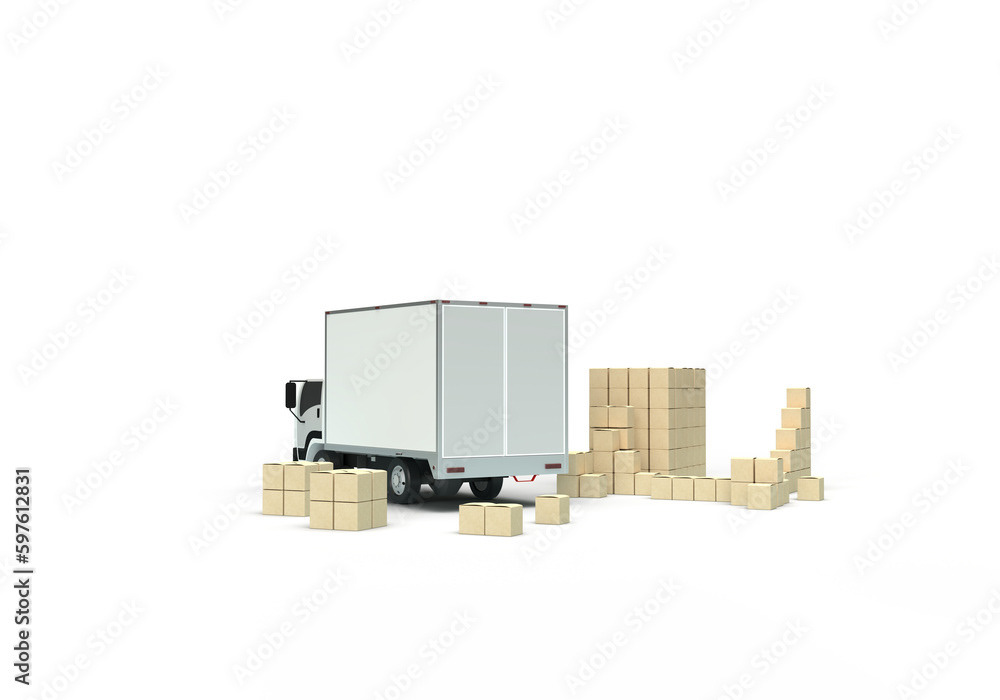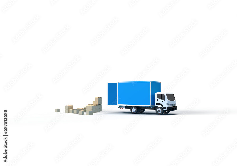 3d render illustrations of a truck, furniture, boxes. Illustration on the topic of cargo transportation, relocation, change of residence, commercial transport, delivery of sea cargo, transport and things. Modern style.