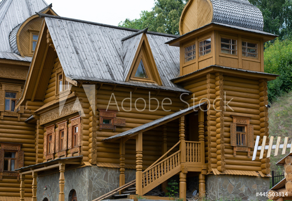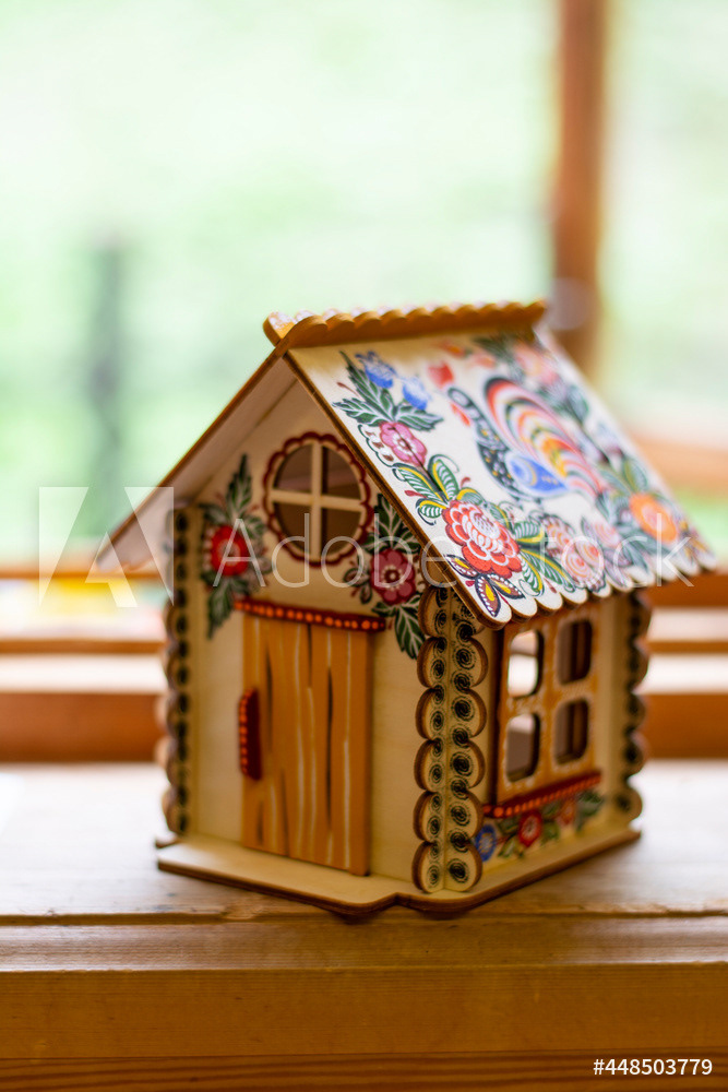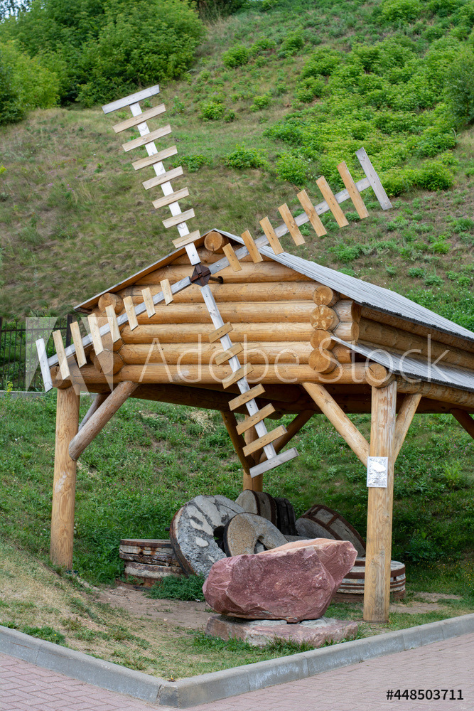 A trip to the house of creativity and crafts. Wooden three-storey house. On the facade of the mill. The house has a wooden gate. Photos of handmade crafts, such as: clay pots, clay toys, wooden ornaments and products.