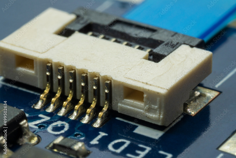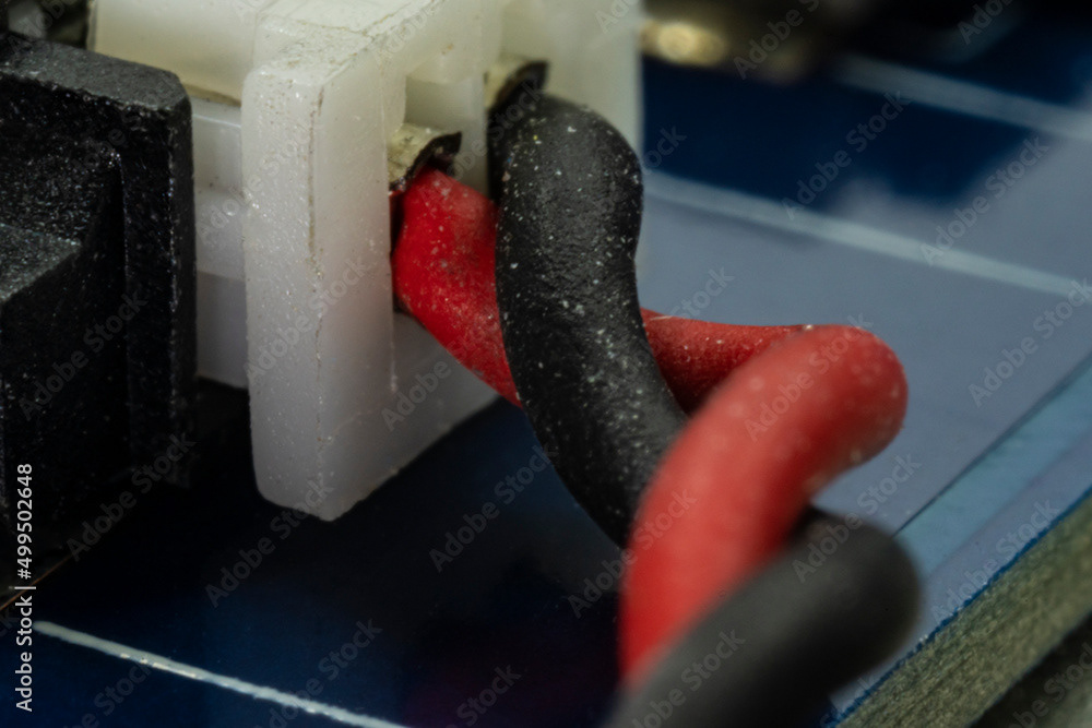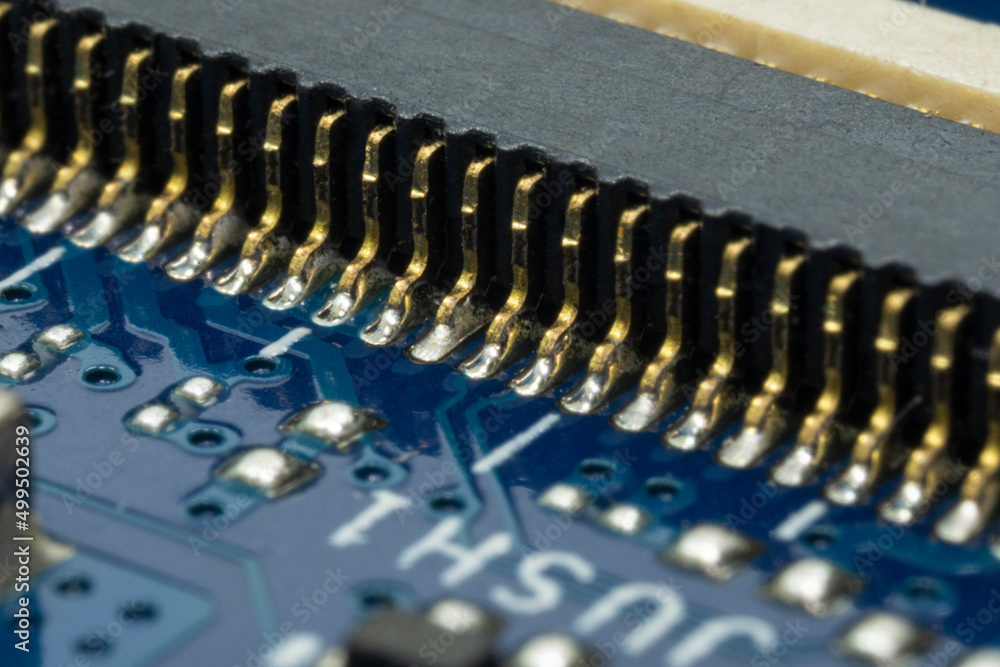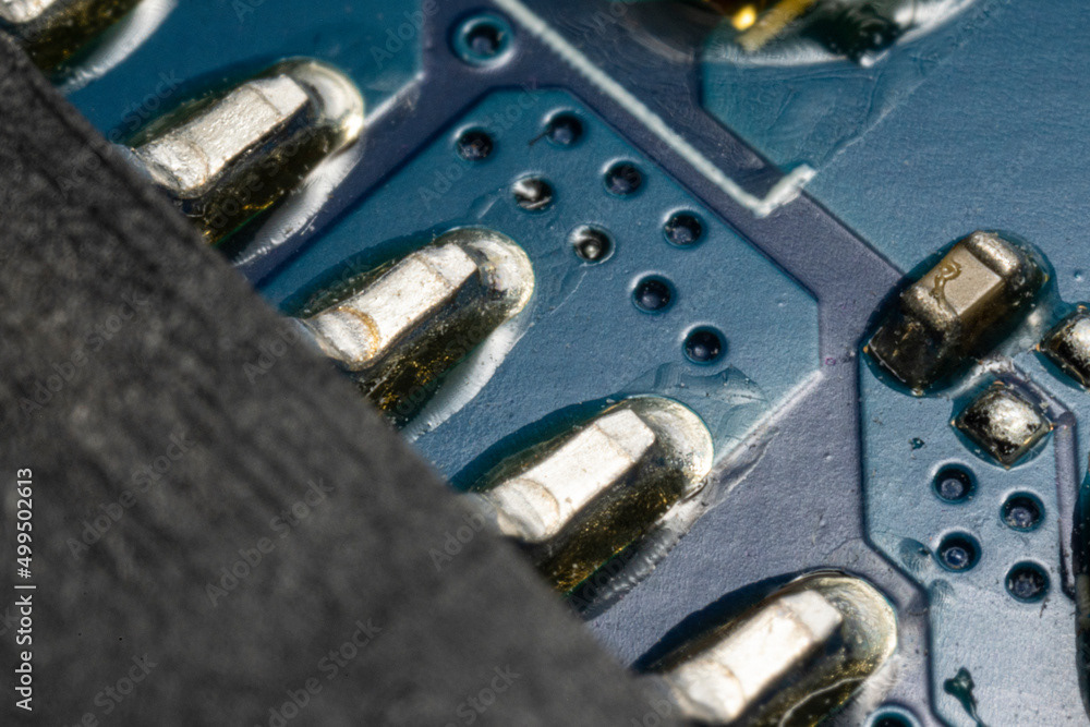 Macro photos of electrical elements on the motherboard. Close-up photos of wires, chips, buttons, connectors, transistors.