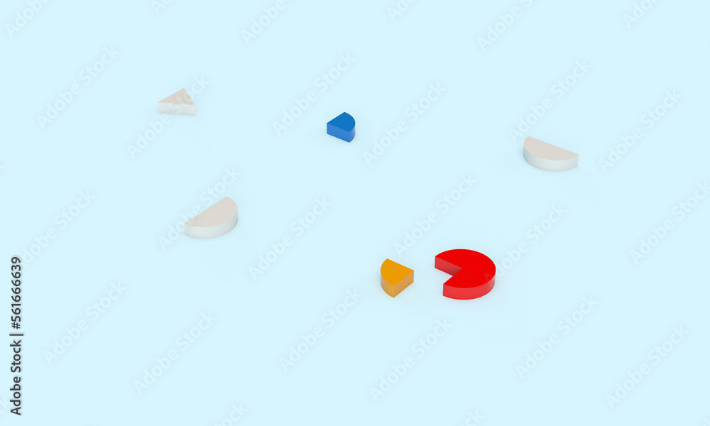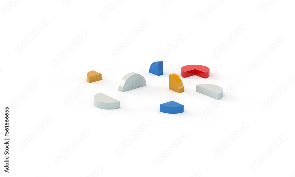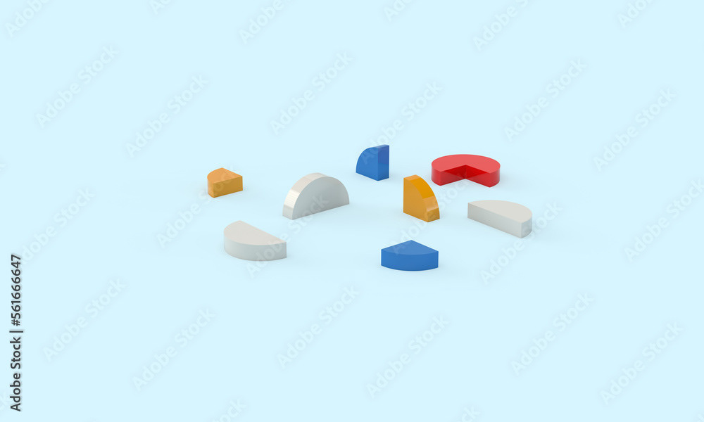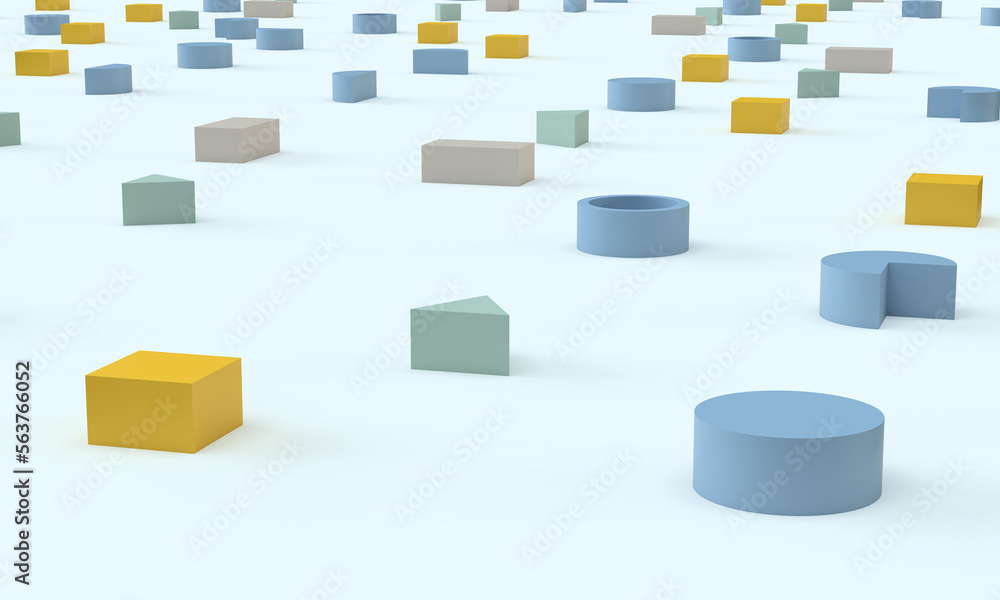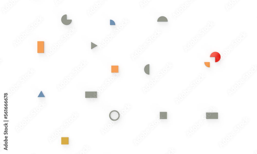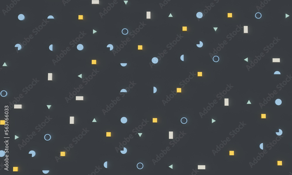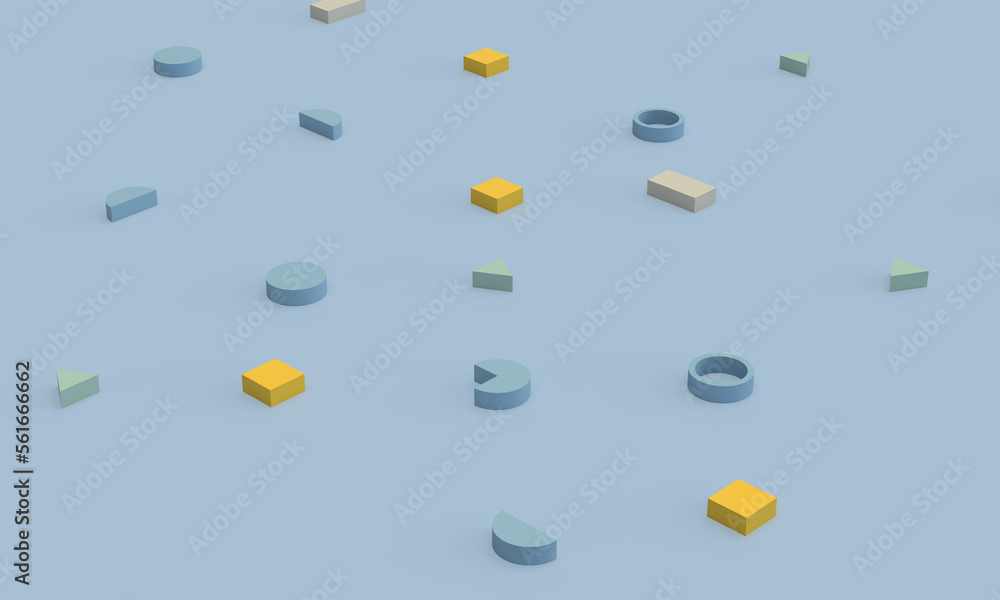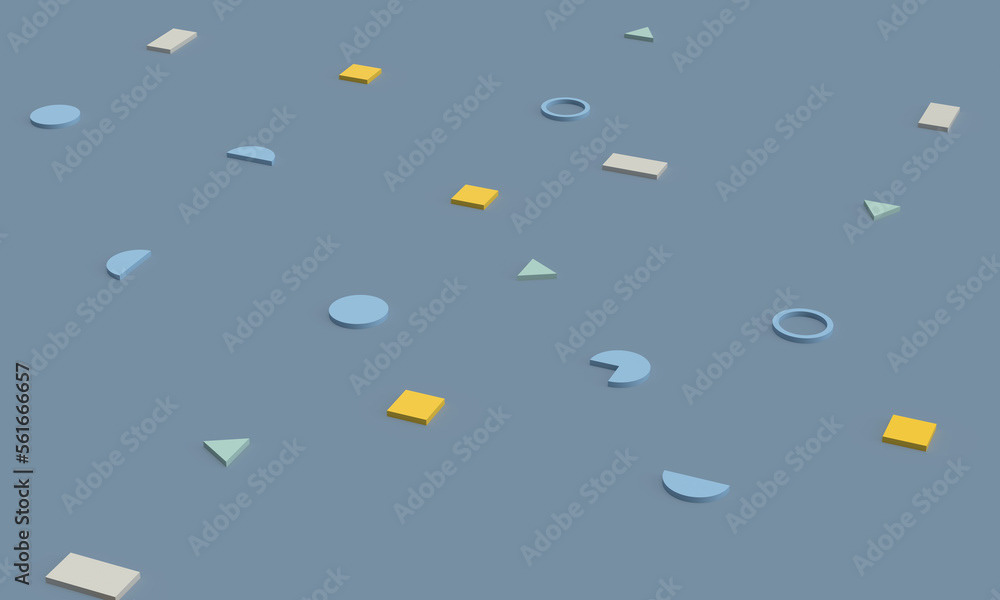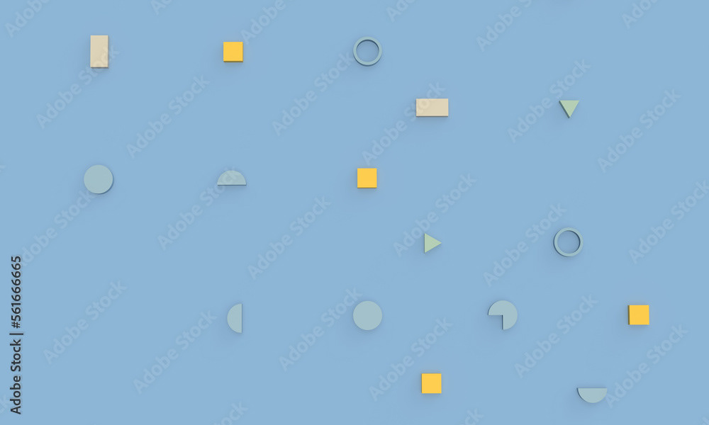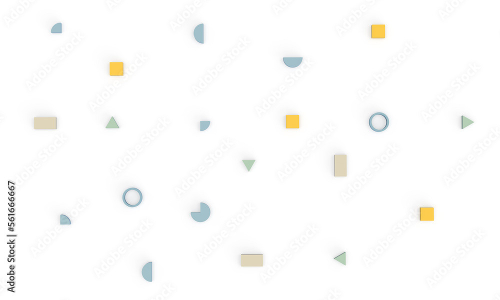 3d rendering of illustrations of geometric shapes. Pattern of shapes of rectangles, circles, triangles. Modern minimal style.