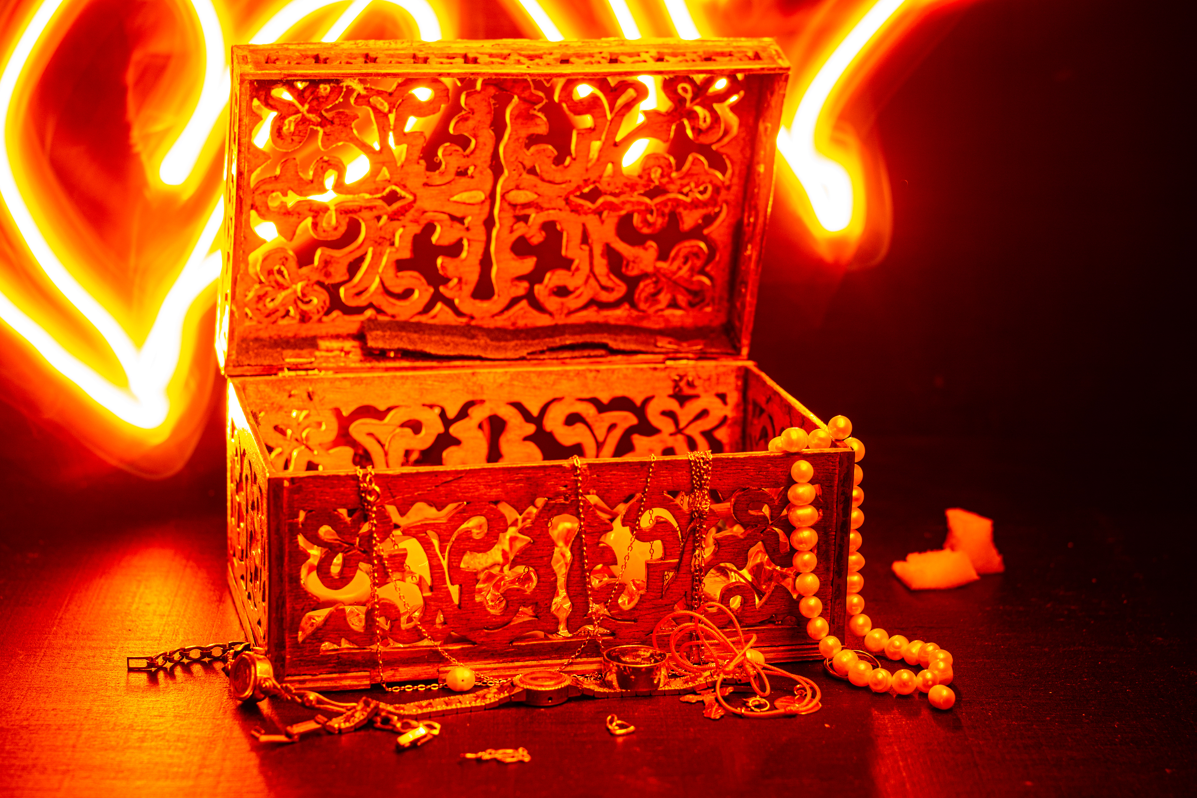 There was an old box. I removed the cloth inside. There is still a tree with cutouts and patterns. In the dark room, I flashed the light on the box. Simple photo shoot.