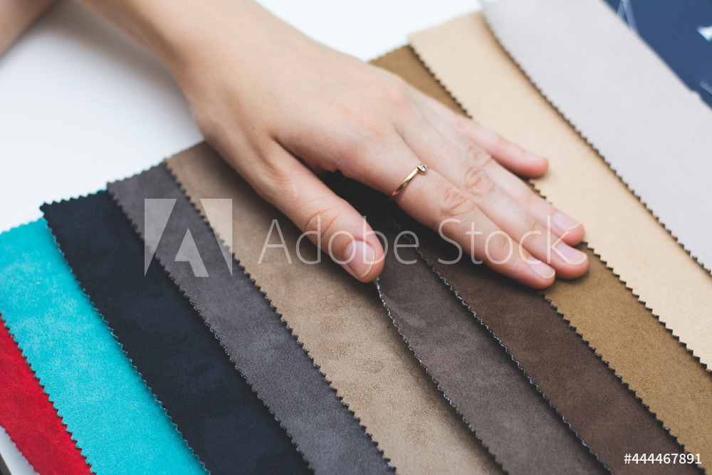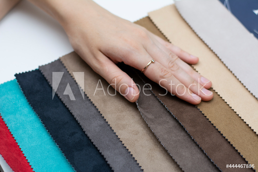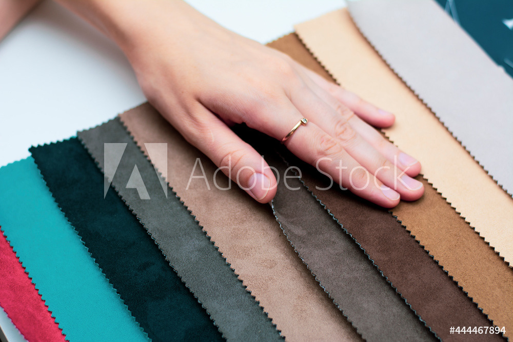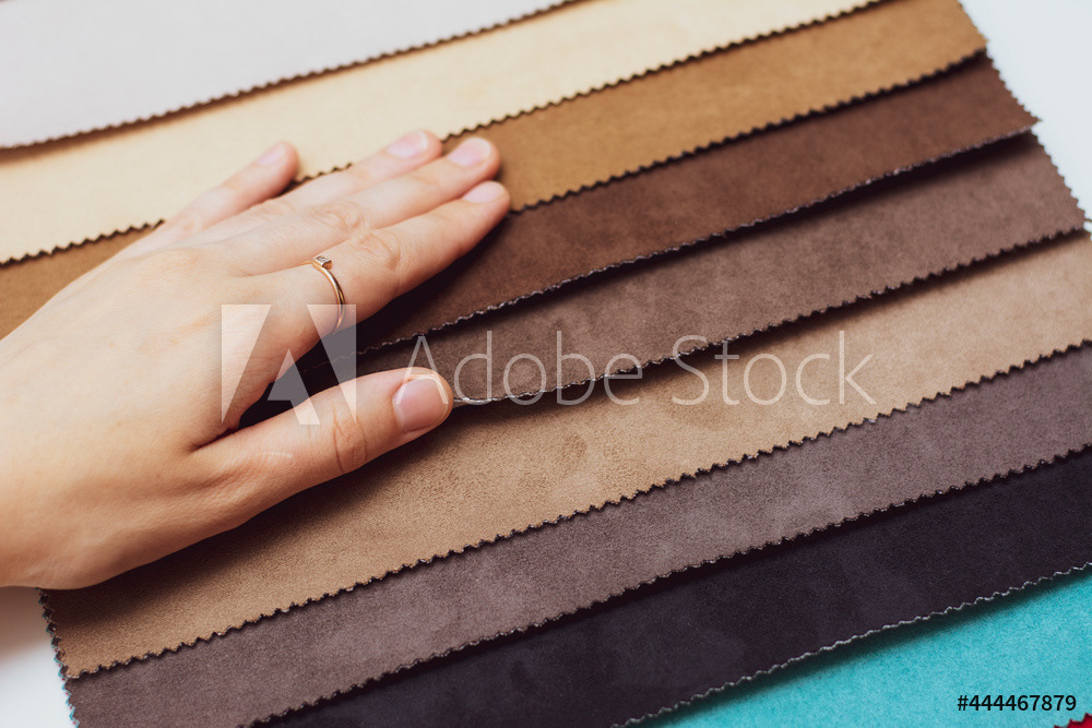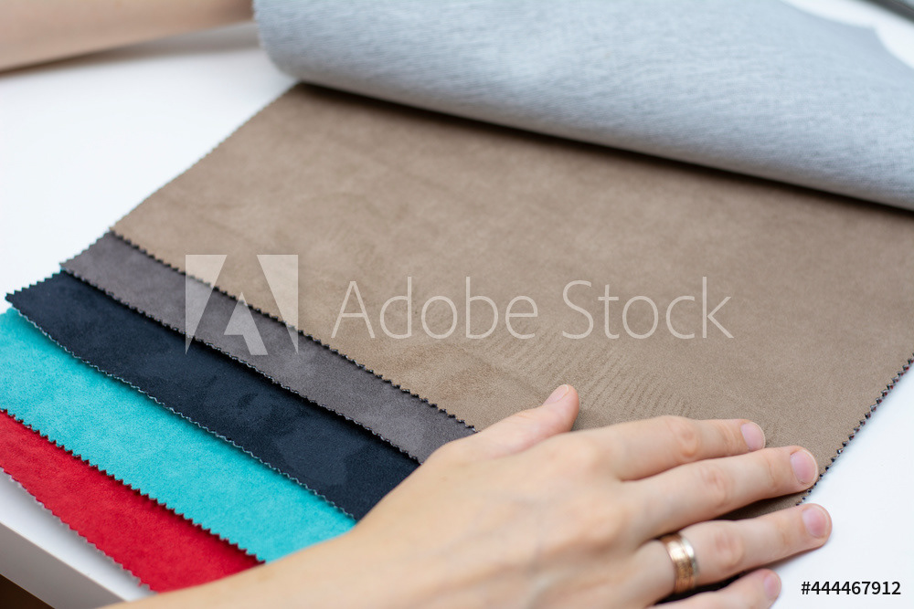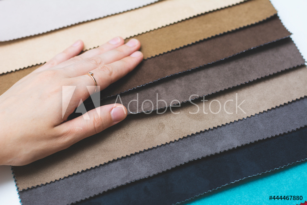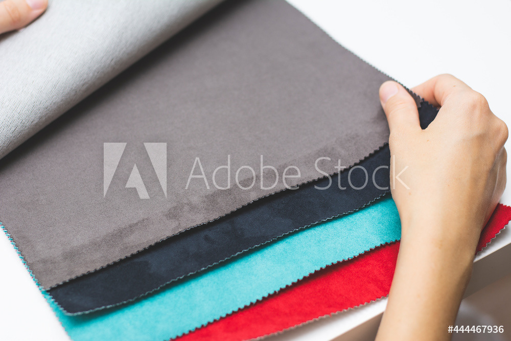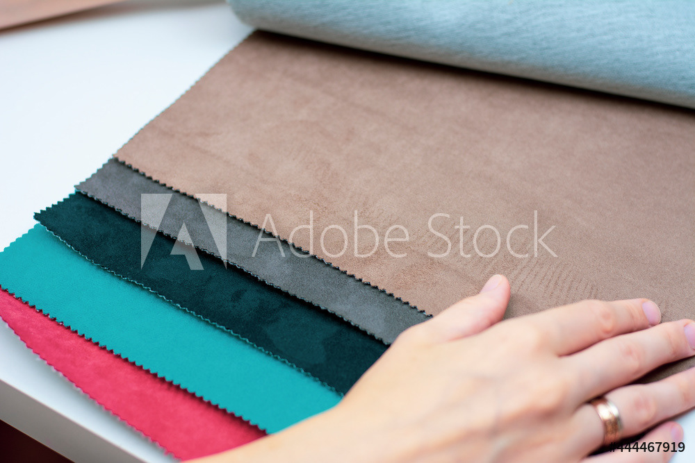 Multi-colored artificial suede colors for sewing clothes, accessories, furniture, car interior and more. Samples of suede fabric in the hands of the girl, on the table. Close-ups of photos and videos.