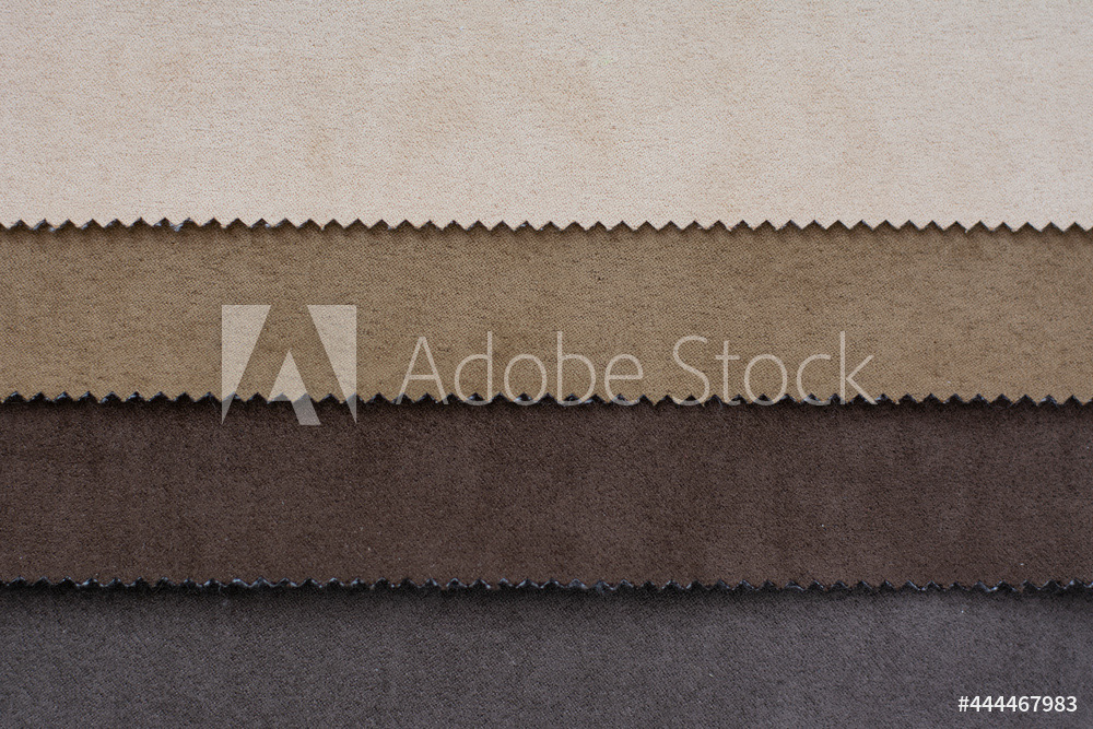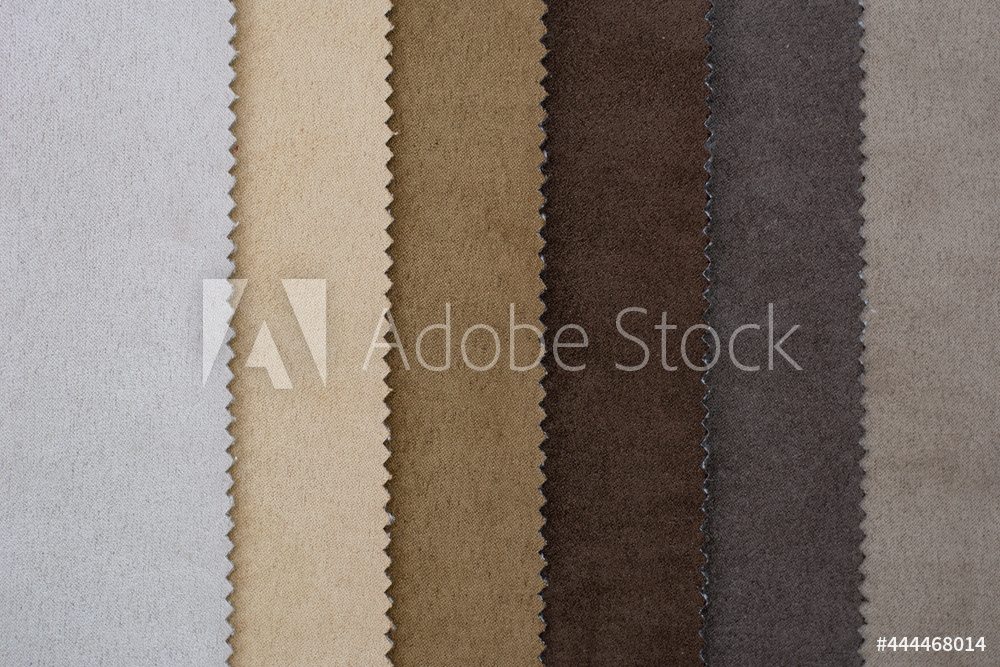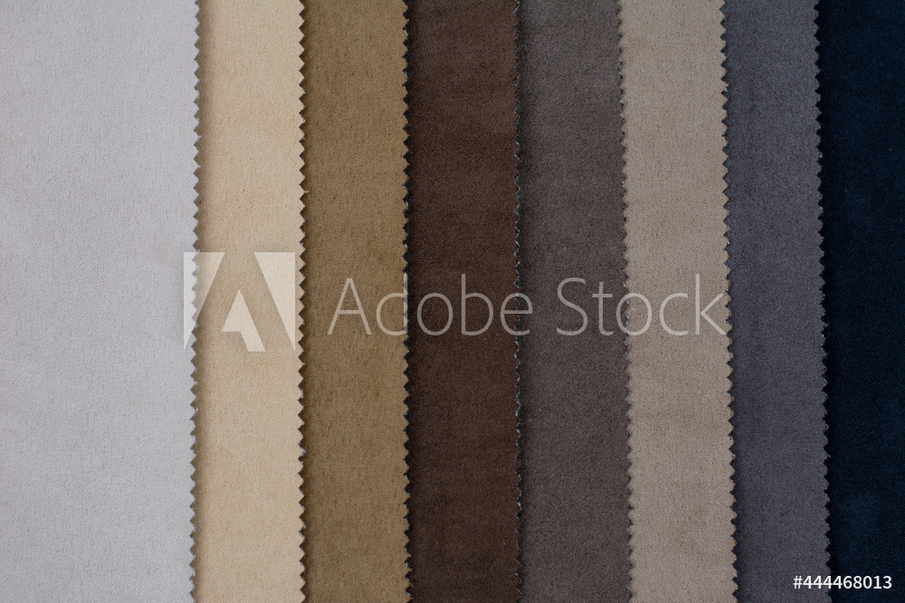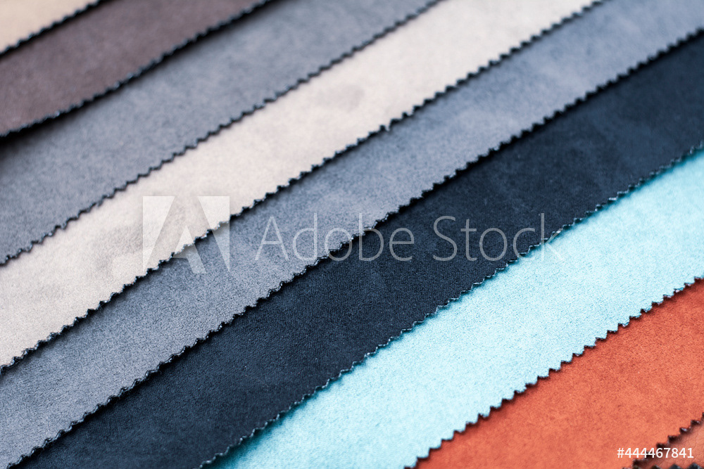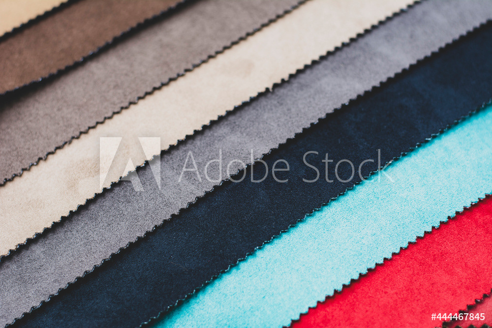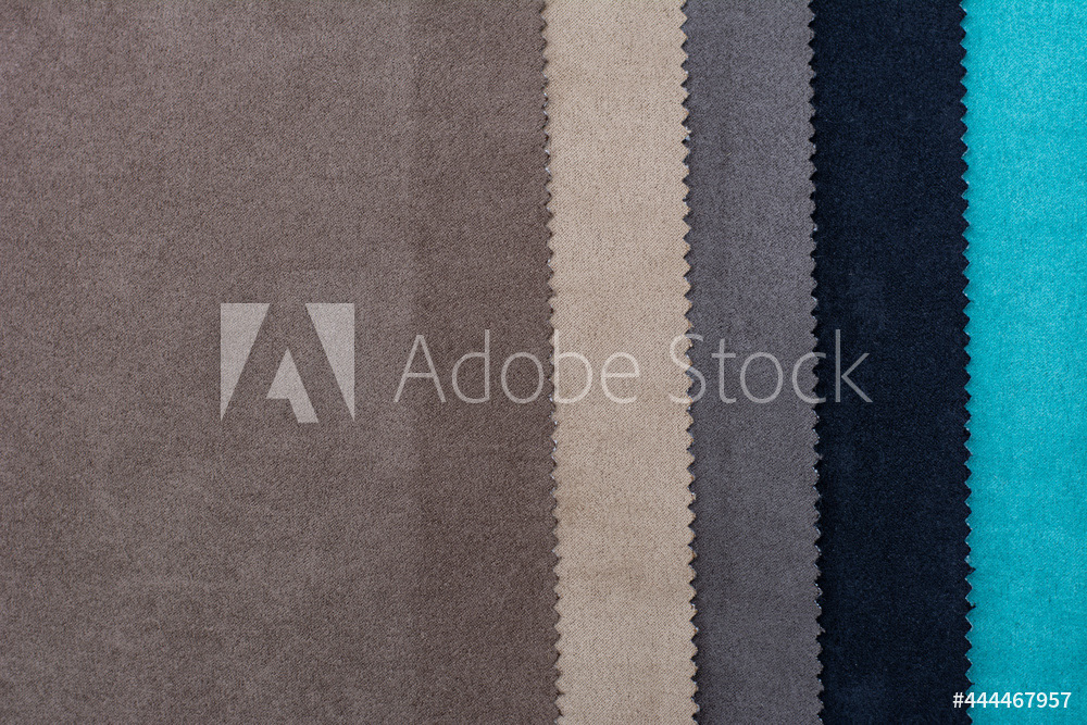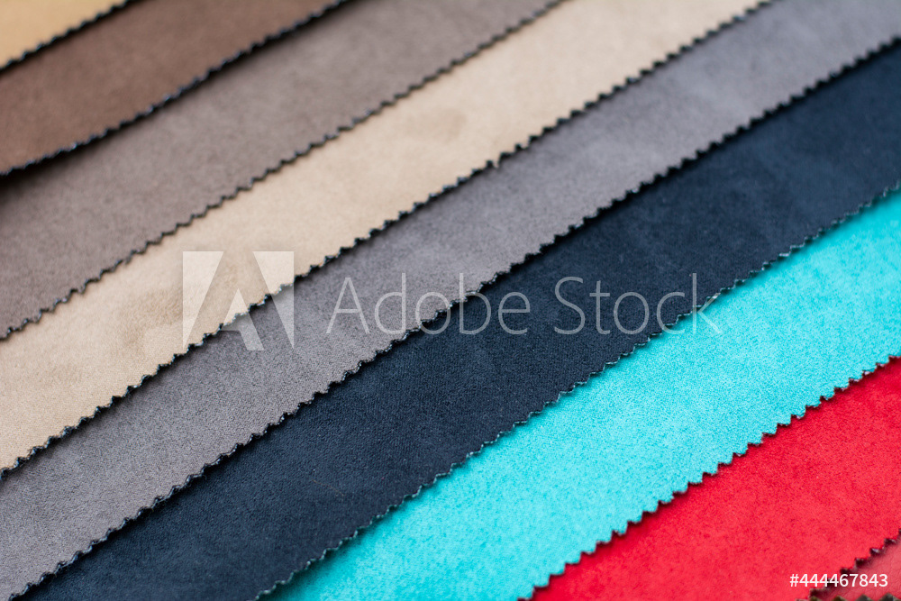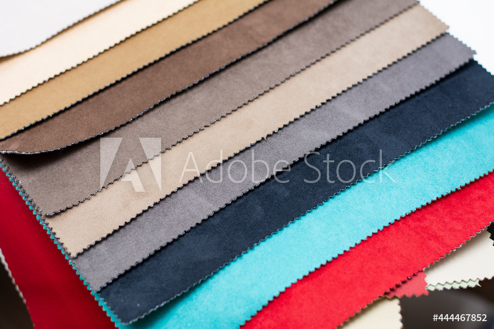 Multi-colored artificial suede colors for sewing clothes, accessories, furniture, car interior and more. Samples of suede fabric in the hands of the girl, on the table. Close-ups of photos and videos.