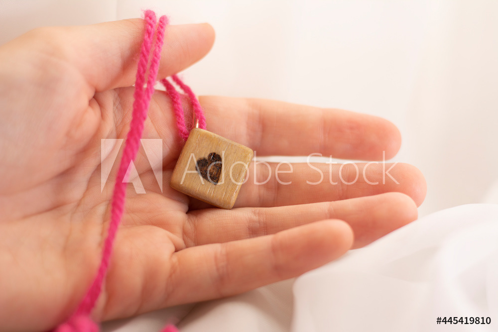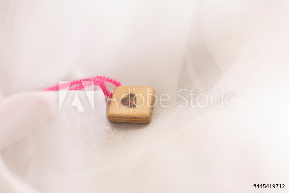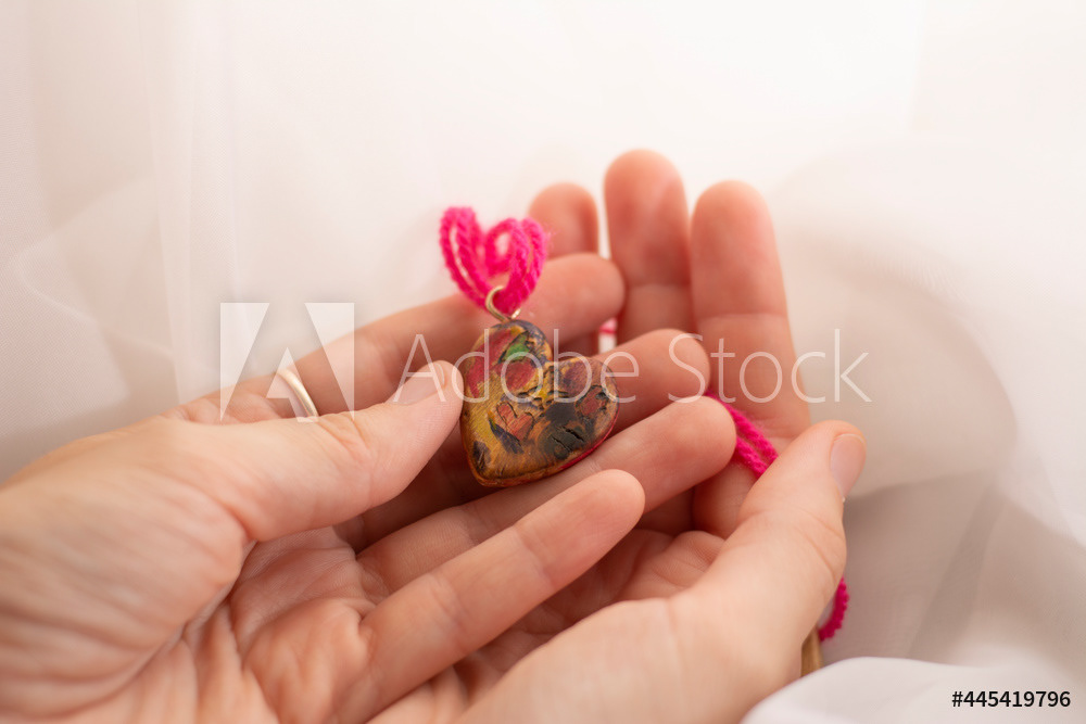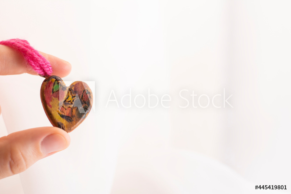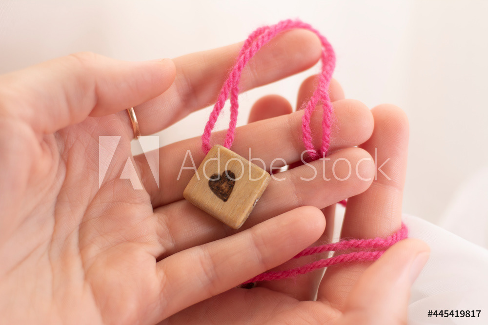 In women's hands, a wooden craft is a symbol of the heart, love and tenderness. Pink thread, light background.